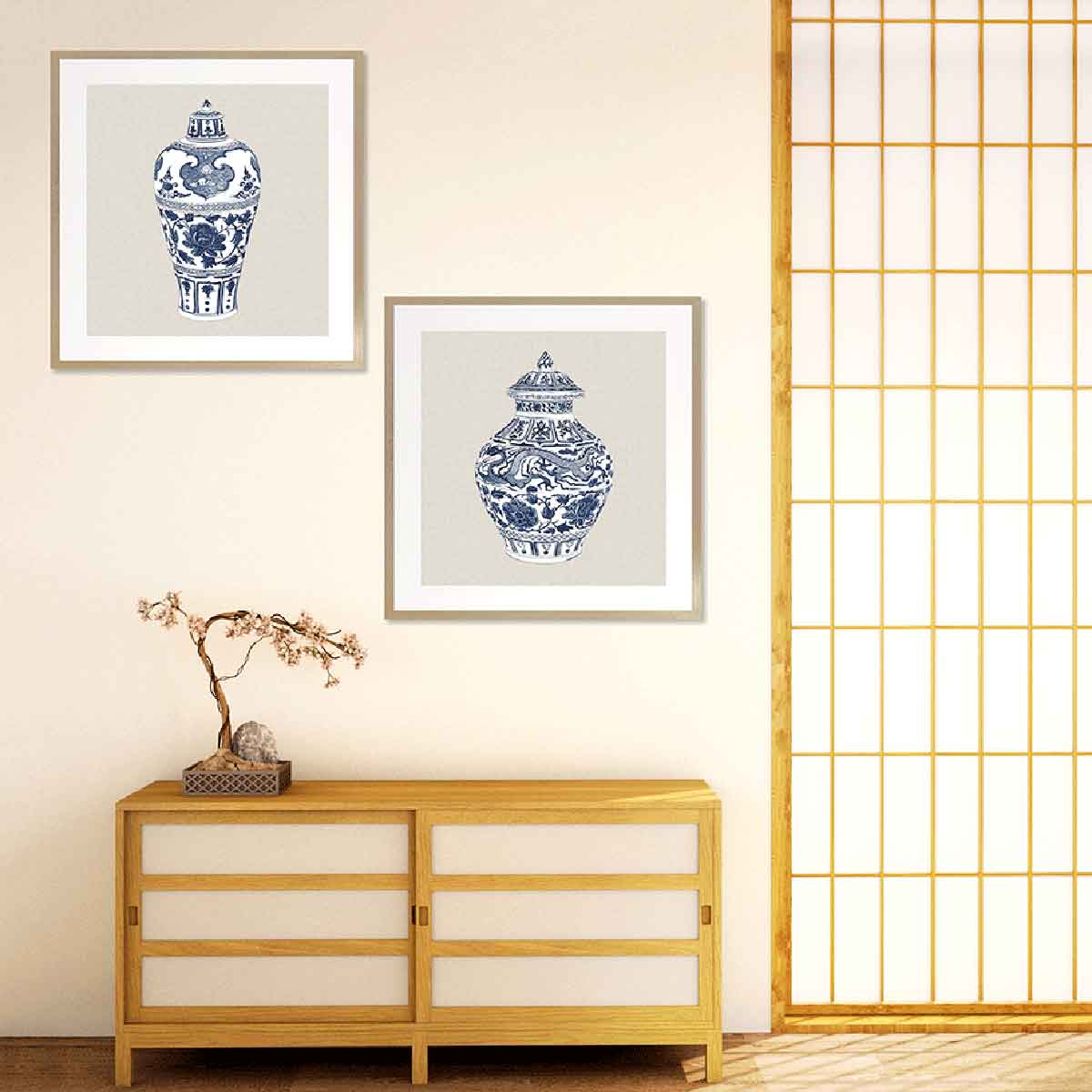 A beautiful Antique Chinoiserie Vase artwork finished in a light oak effect frame and white mount. Available in partner image, these images work very well individually but are also stunning as a pair.