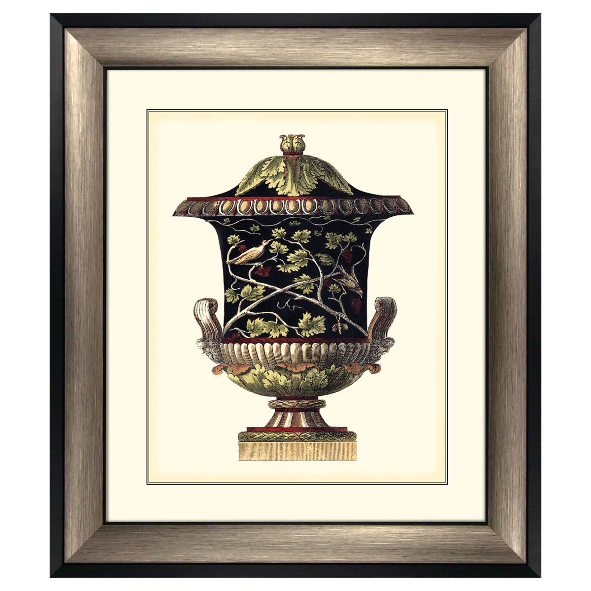 This Antique style urn artwork with a detailed vase with a black background and floral detail by Antonini DaCarlo is finished with a bronze scoop frame.