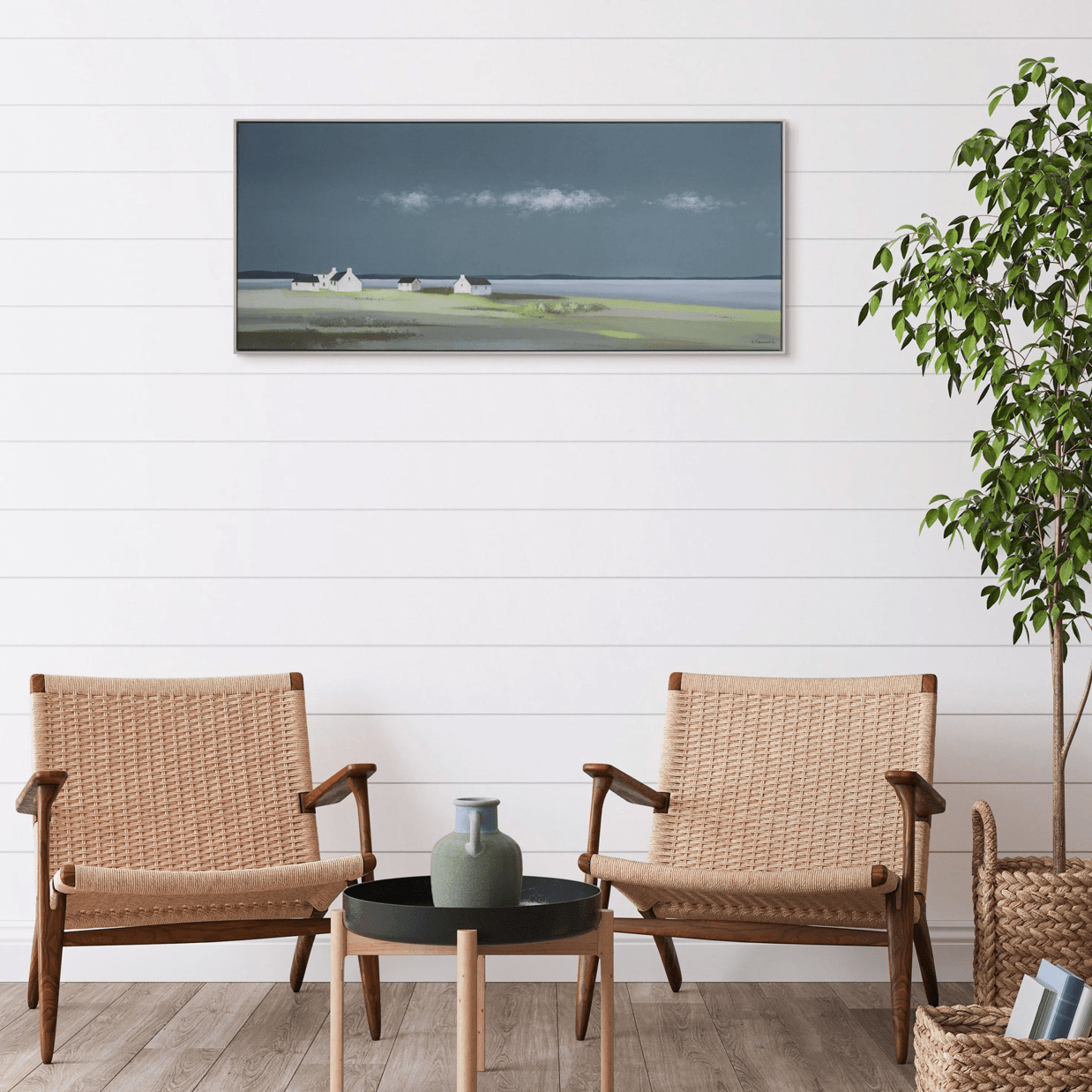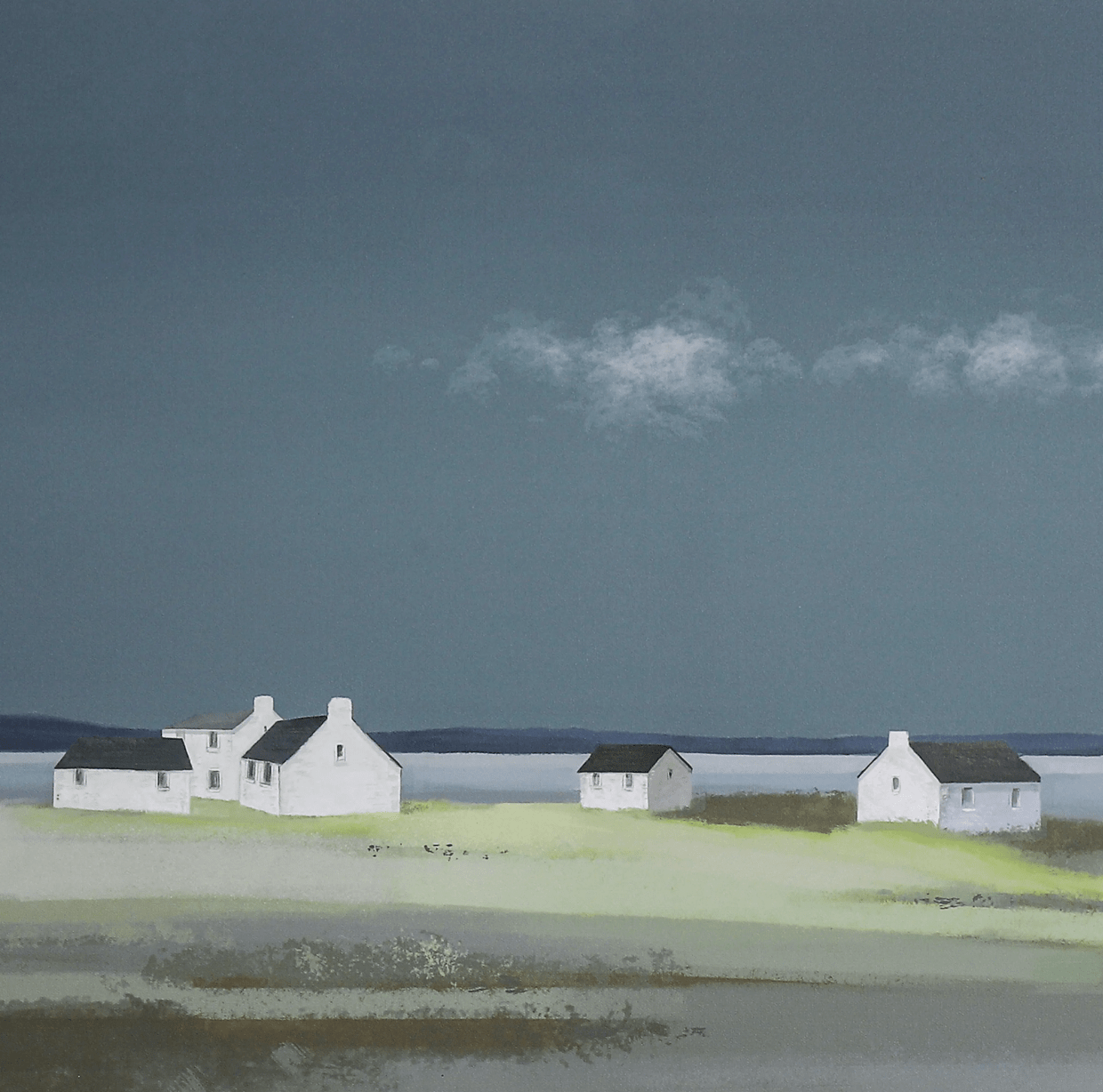 Introducing 'Days End,' a framed wrapped canvas by artist Ulyana Hammond. This striking piece captures the serene beauty of a coastal landscape, featuring soft hues of gray and muted greens that evoke a sense of tranquility. The minimalist depiction of simple dwellings against a vast backdrop exemplifies contemporary craftsmanship, making it a versatile addition to various decor styles. The high-quality canvas is expertly wrapped and framed, ensuring durability and a polished look for your space. Measuring [insert dimensions], it’s ideal for creating a focal point in living rooms, hallways, or offices. This artwork not only enhances your environment but also reflects a curated sense of style, embodying timeless elegance without pretension.