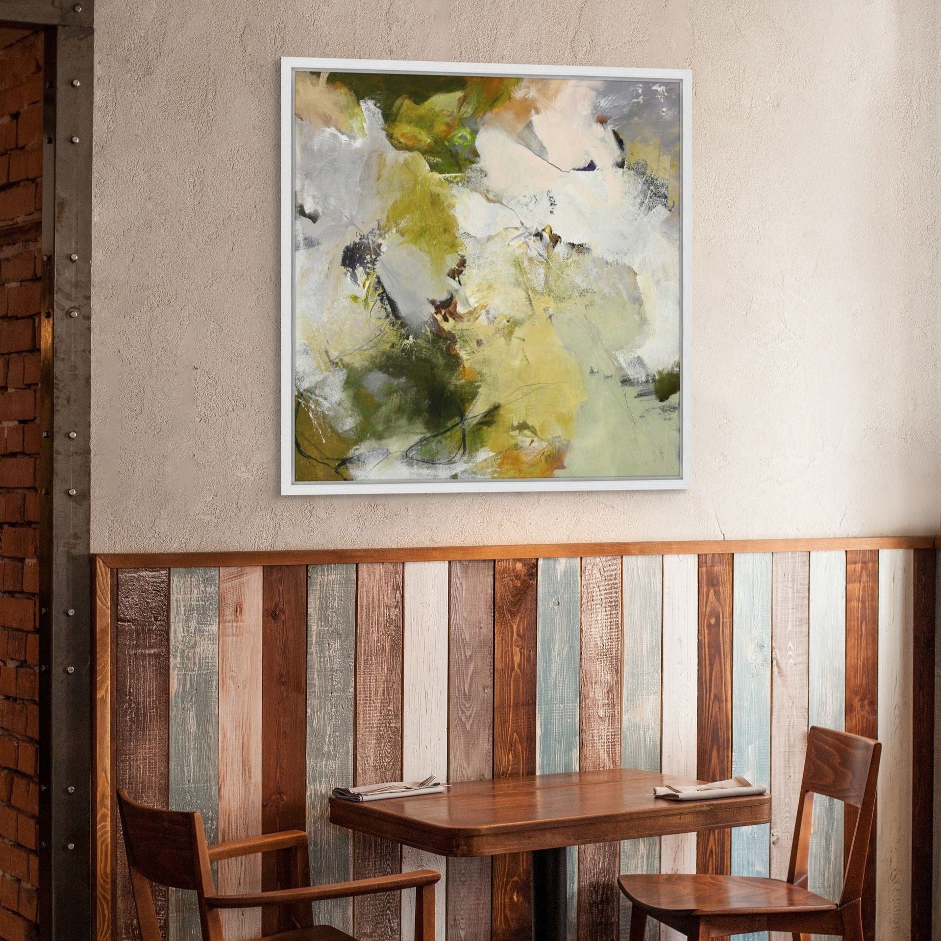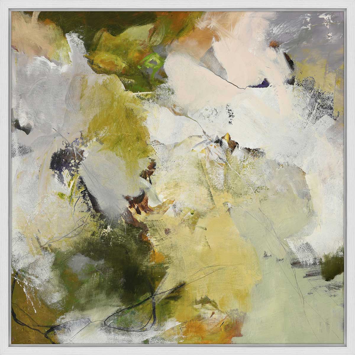 The Evergreen 2 art piece features a slim white limed wood effect frame that complements its vibrant abstract composition. This artwork showcases a harmonious blend of white, yellow, and green hues, creating a dynamic visual experience. The textured layers and brush strokes add depth, inviting viewers to explore its contemporary aesthetic. Crafted with precision, the high-quality materials ensure longevity while enhancing any modern living space. Ideal for a variety of settings, from living rooms to offices, this piece serves not just as decor but as a conversation starter, reflecting timeless craftsmanship and curated design.
