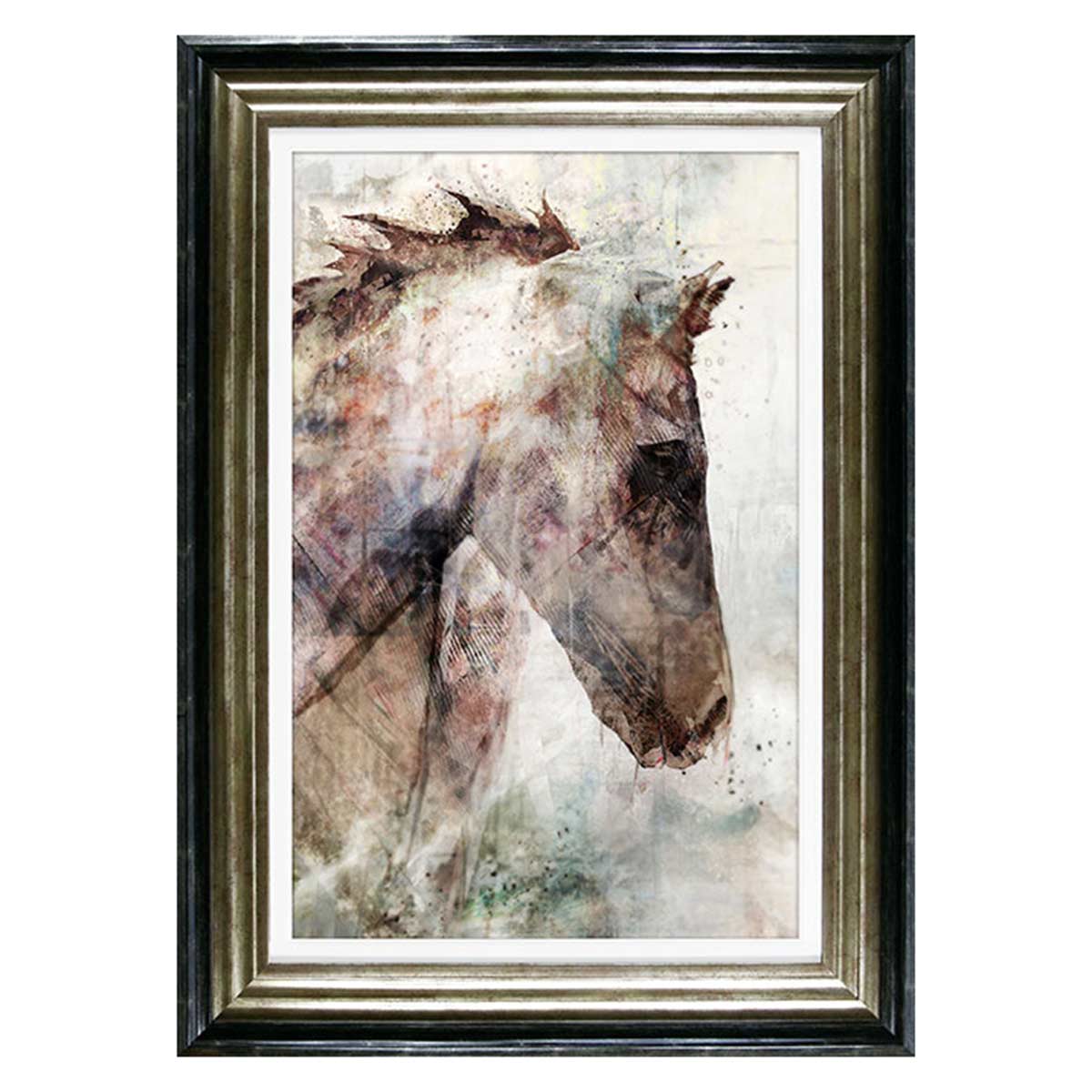 Over Varnished print of a horse, mid motion, framed with a white slip and black and champagne gold moulding. Available with a complementing partner artwork.