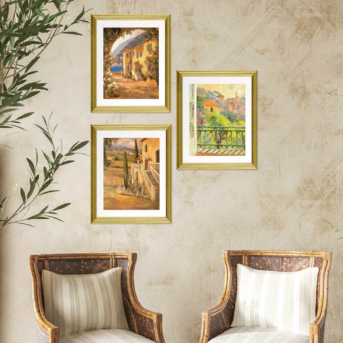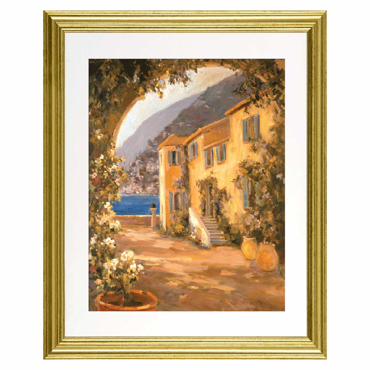 Beautiful image of an Italian Villa scene in Summer by Allayn Stevens, finished in a slim gold frame and a white mount. A lovely Italian inspired artwork, we have two other complementary pieces, Italian Summer 1 and 3.