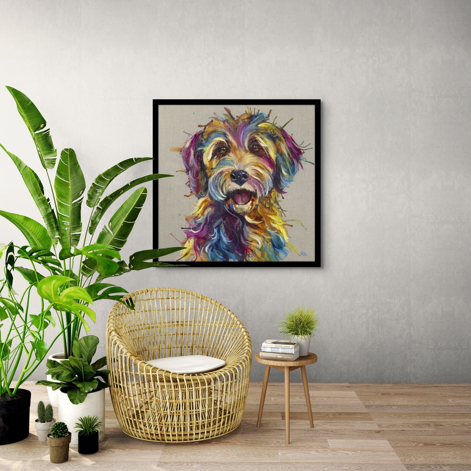 The Luna artwork print features a vibrant depiction of a dog's face, expertly painted on a textured beige background that enhances its colourful details. The black frame adds a contemporary touch, creating a striking contrast that draws the eye to the intricate brushwork and lively palette. Hand-finished with a unique textured gel, this piece stands out without the need for glass, allowing for a tactile experience. The joyful expression of the dog, highlighted by splashes of colour, brings warmth and personality to any space, making it a perfect addition to modern interiors. Crafted with care, Luna exemplifies quality and timeless craftsmanship, ensuring it remains a cherished piece for years to come.