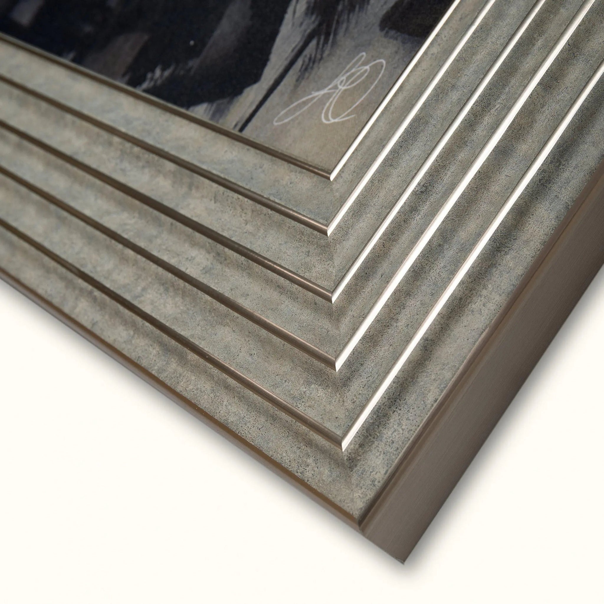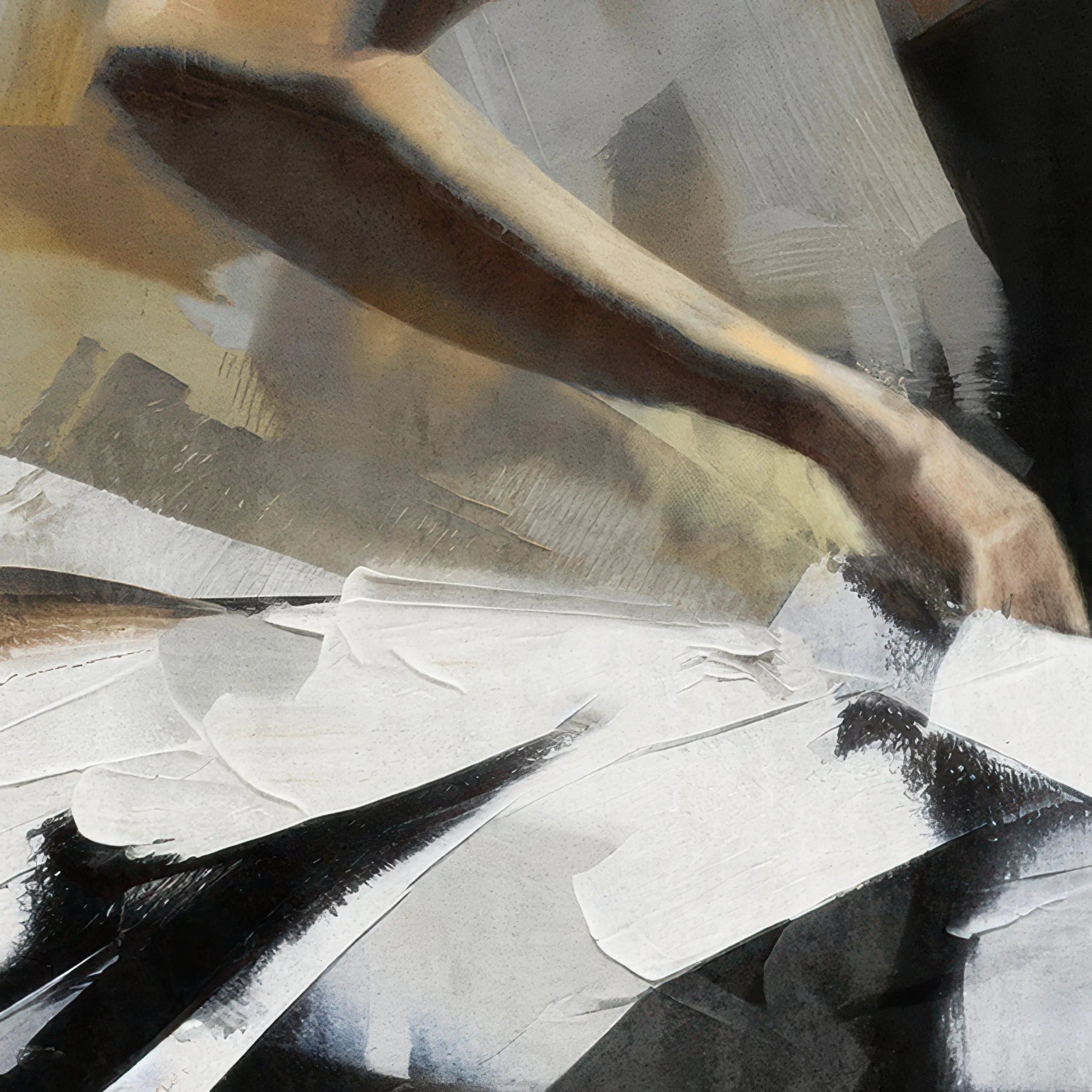 An elegant woman in a monochrome tutu stands with grace. Set on a textured background, the abstract oil painting by Faye Reynolds-Lydon captivates with its contrast in style, from a palette knife application across the flamboyant dress to fine art detail towards the lady's profile. The cinematic lighting and warm colour selection infuse the composition with energy, while a decorative stone frame with champagne highlights serves as a sophisticated accent, drawing attention to the delicate edging and enhancing the overall aesthetic.