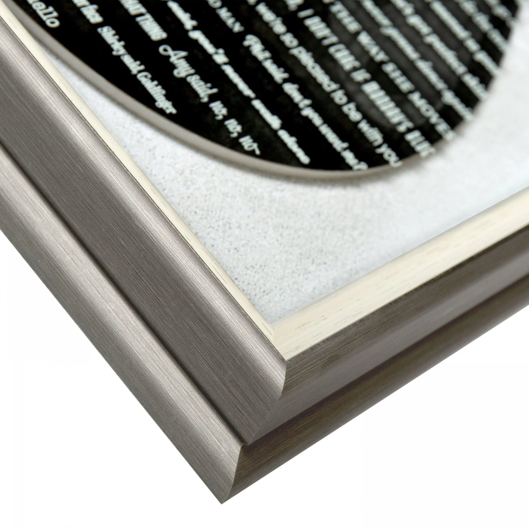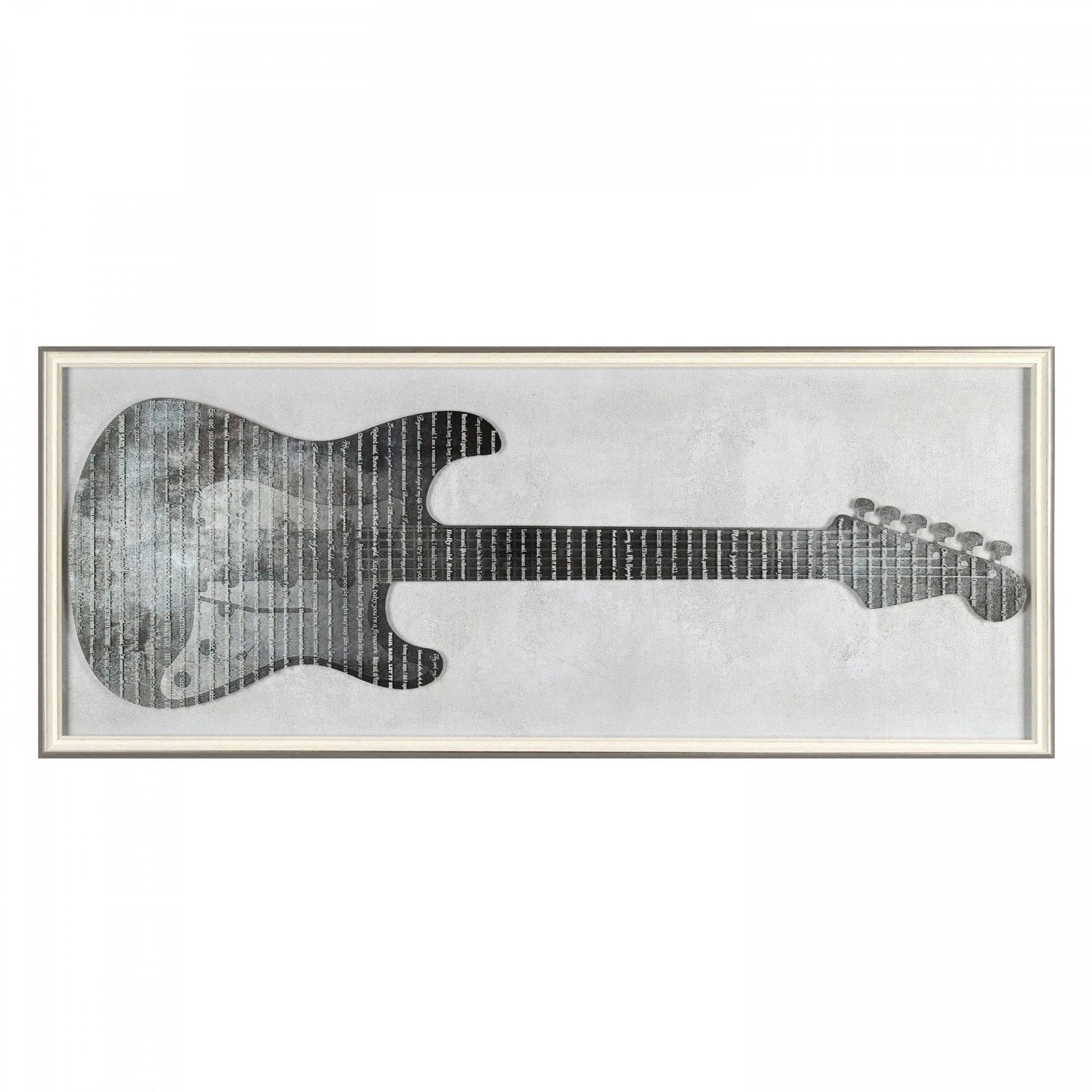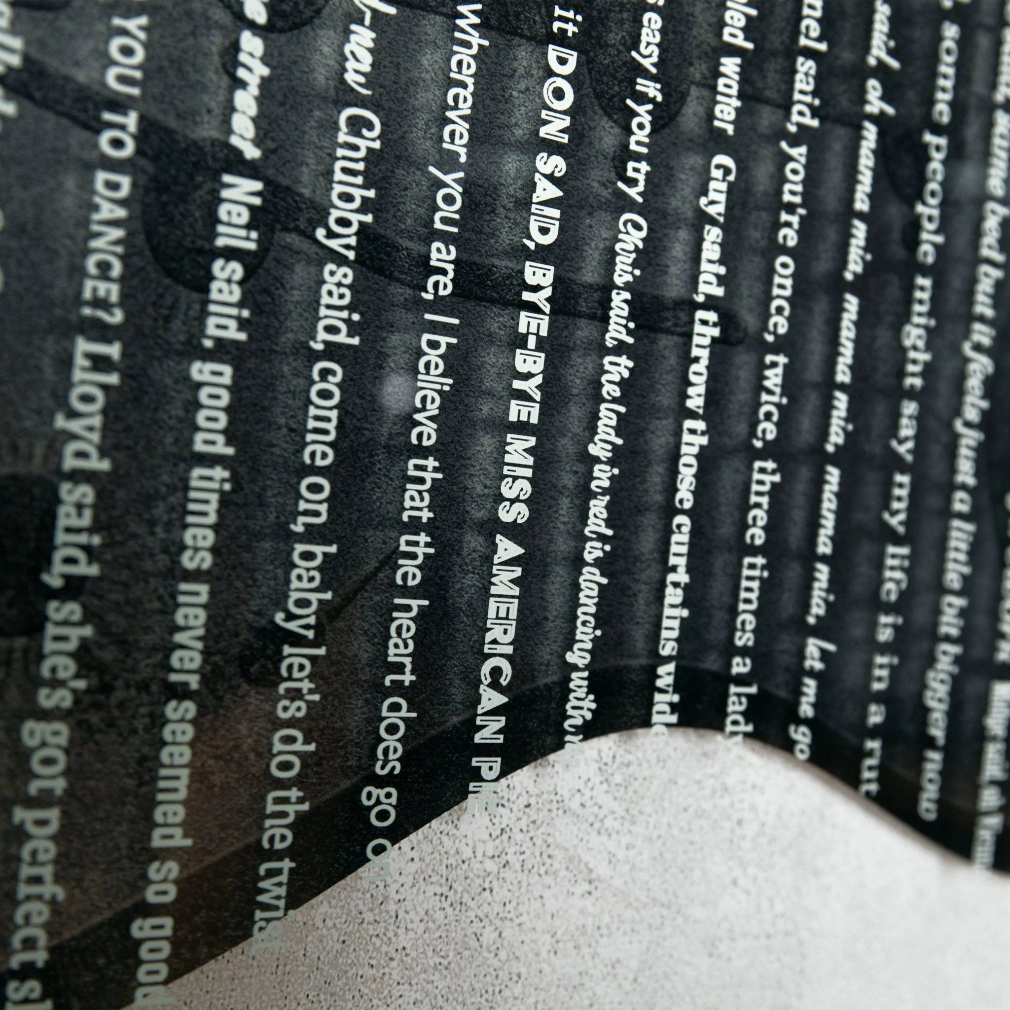 A digital illustration of a classic electric guitar with a twist...threaded over the body and neck of the magnetic instrument, notorious lyrics from across the evolution of rock music reveal themselves, along with the spoken band member. Artist Karen Reavill selects an eclectic mix of fonts to bring the lyrics alive across this finely tuned rock legend. The enthralling graphics are carefully printed onto the glazed, above the metallic body, to create a sense of depth.