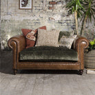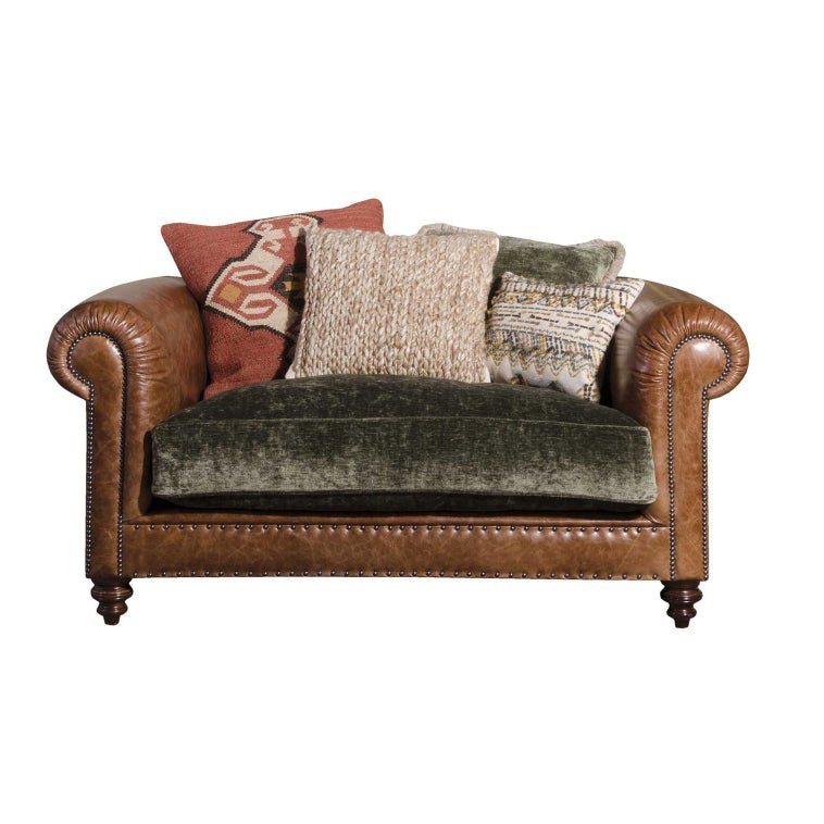 The Tetrad Constable Snuggler is characterised by its combination of leather and velvet upholstery. We sell this model online in the configuration shown - the generous scroll arms are upholstered in Galveston Bark Leather which has a warm brown colour and is accented along the arms and base with studding. In contrast, the seat cushions are upholstered in Coco Velvet, olive green, with a feather-wrapped foam core interior.