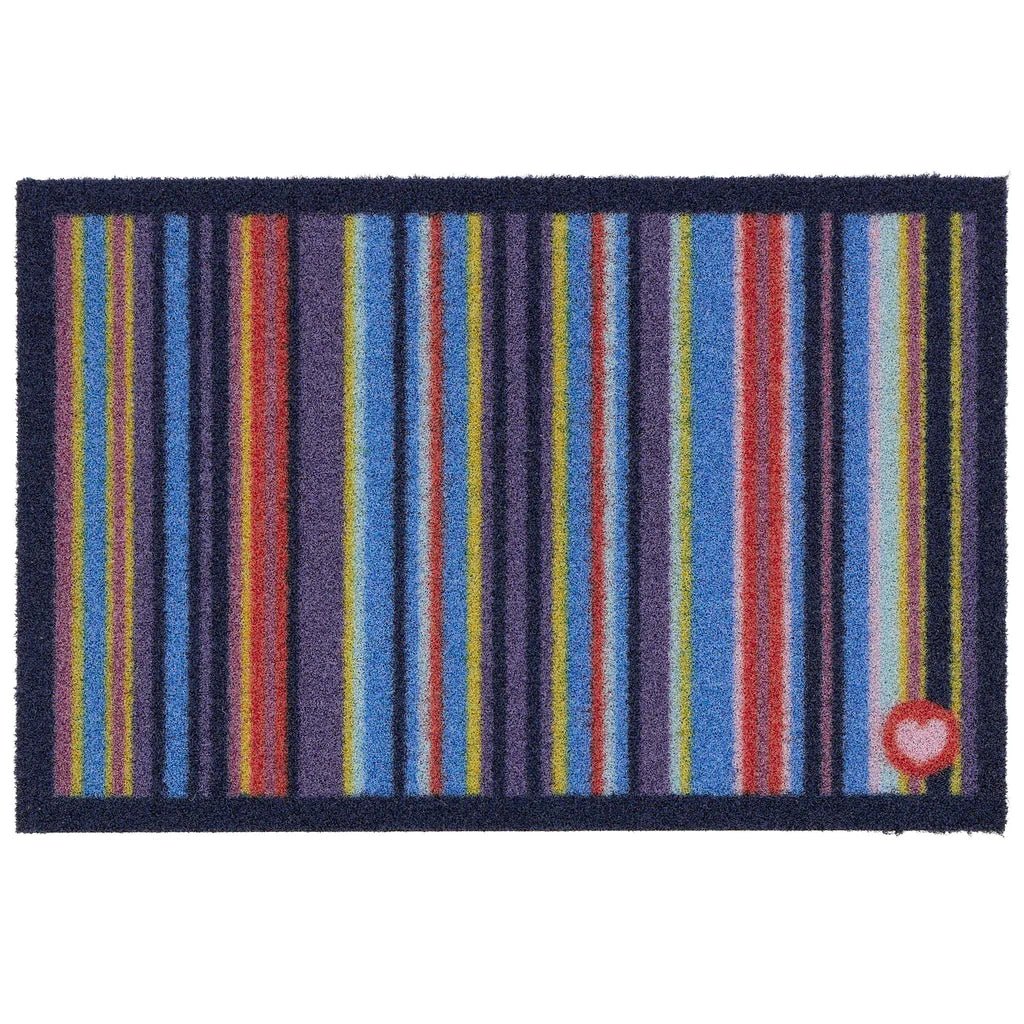 This Eco friendly doormat design features vertical stripes in yellow, blue, pink, red, purple, and navy.