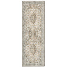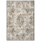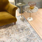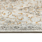 Our Washable Baroque rug has a light grey background with a classic baroque inspired design in a dark grey, with gold accents.