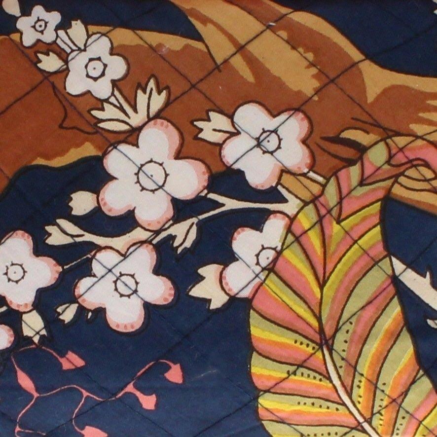 The vibrant print features stylised exotic flowers in pinks, oranges and greens set on a rich blue background helping to make the vibrant flowers pop out.