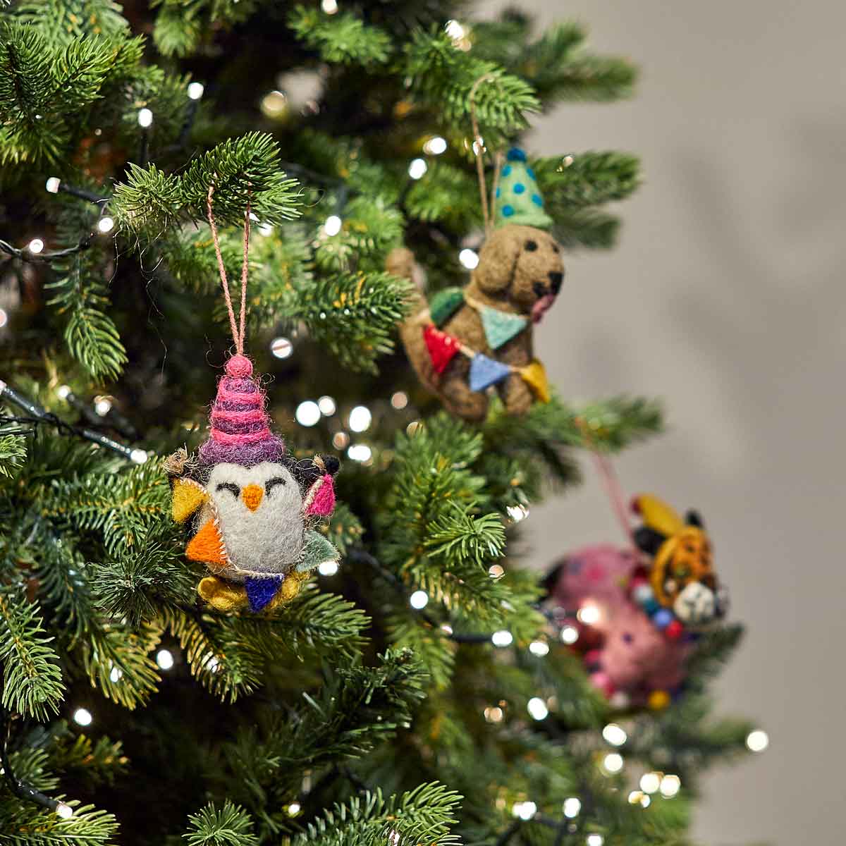 The multi-coloured bunting wrapped around him adds a pop of color and flair, while his pink and purple striped party hat gives him the perfect penguin panache.
