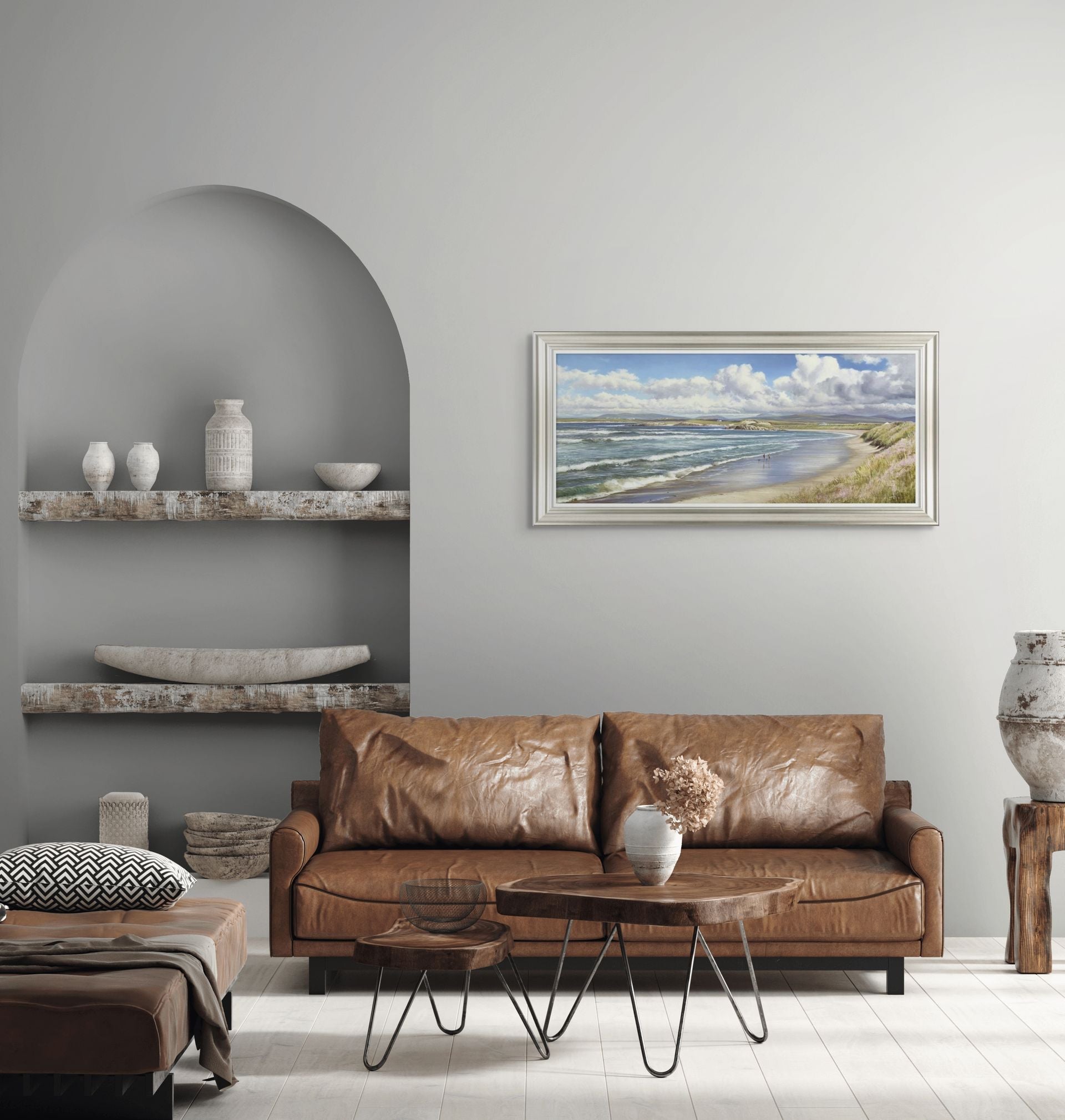 The 'Silence of The Shore' art print captures the tranquil beauty of a coastal landscape, elegantly framed in an antique-style silver frame that enhances its classic appeal. The print features a serene beach scene with gentle waves lapping against the shore, under a vast sky filled with soft, billowing clouds. This harmonious composition is curated to bring a sense of calm and sophistication to your space. Crafted with high-quality materials, the print is designed to withstand the test of time, allowing you to enjoy its beauty for years to come. Ideal for contemporary and classic interiors alike, it serves as a perfect focal point or complement to your home decor, effortlessly adding a touch of coastal charm to any room.