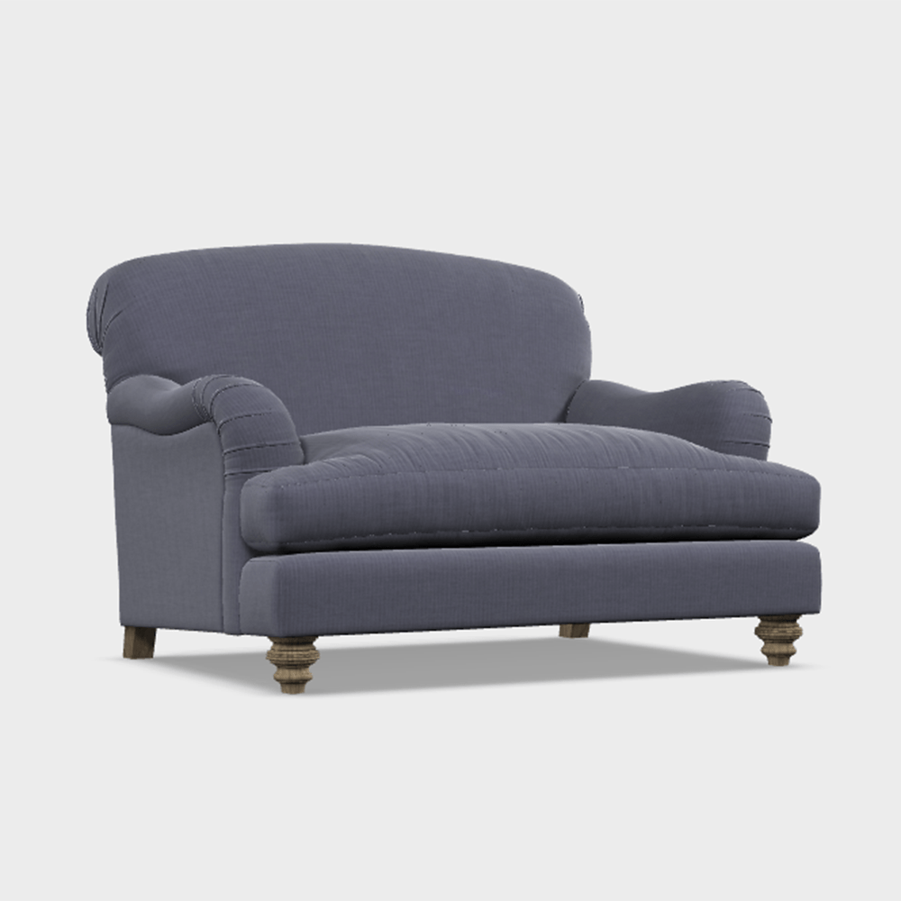 The Tetrad Ruffle Snuggler has a shapely, mid-century modern design that’s finished with traditional turned hardwood legs and soft comfortable cushions.