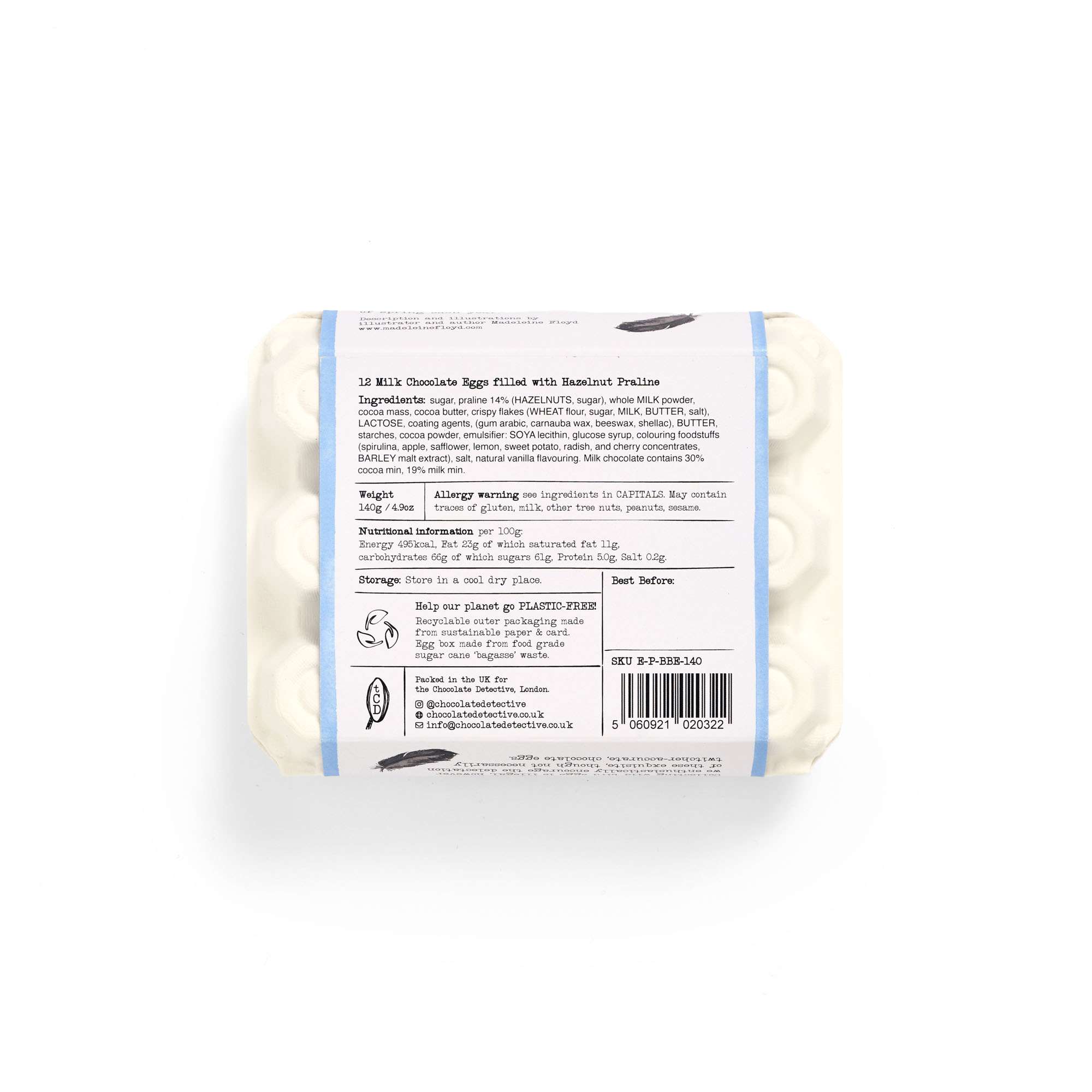 Each pack contains 12 Chocolate Blackbird Eggs. Mixed coloured hazelnut praline and salted caramel eggs.