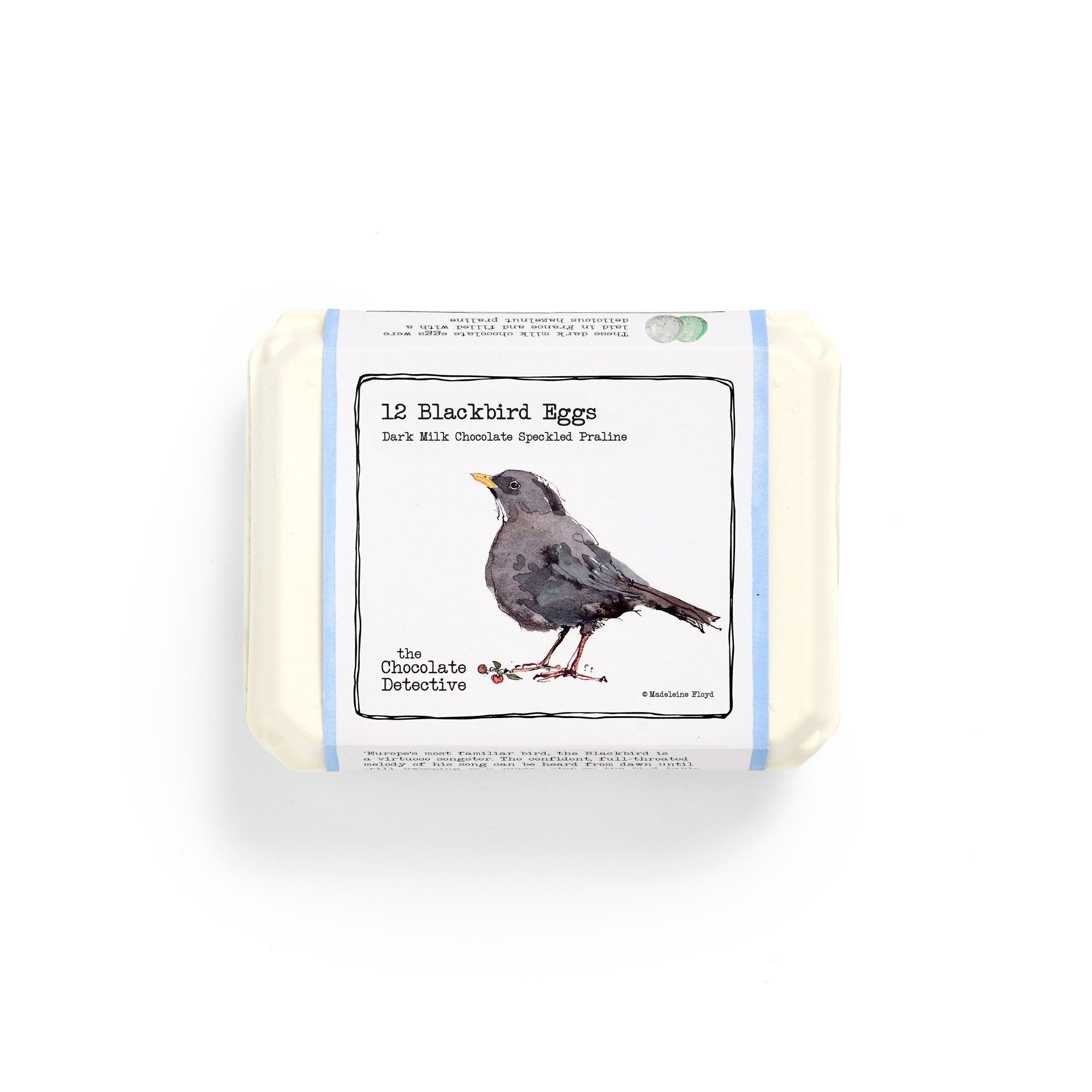 12 Chocolate Blackbird Eggs filled with a fine hazelnut praline. A layer of milk and dark chocolate is filled with the praline and then wrapped in a fine sugar shell and life-like speckles. Please note that this summer the Blackbird is laying white eggs!