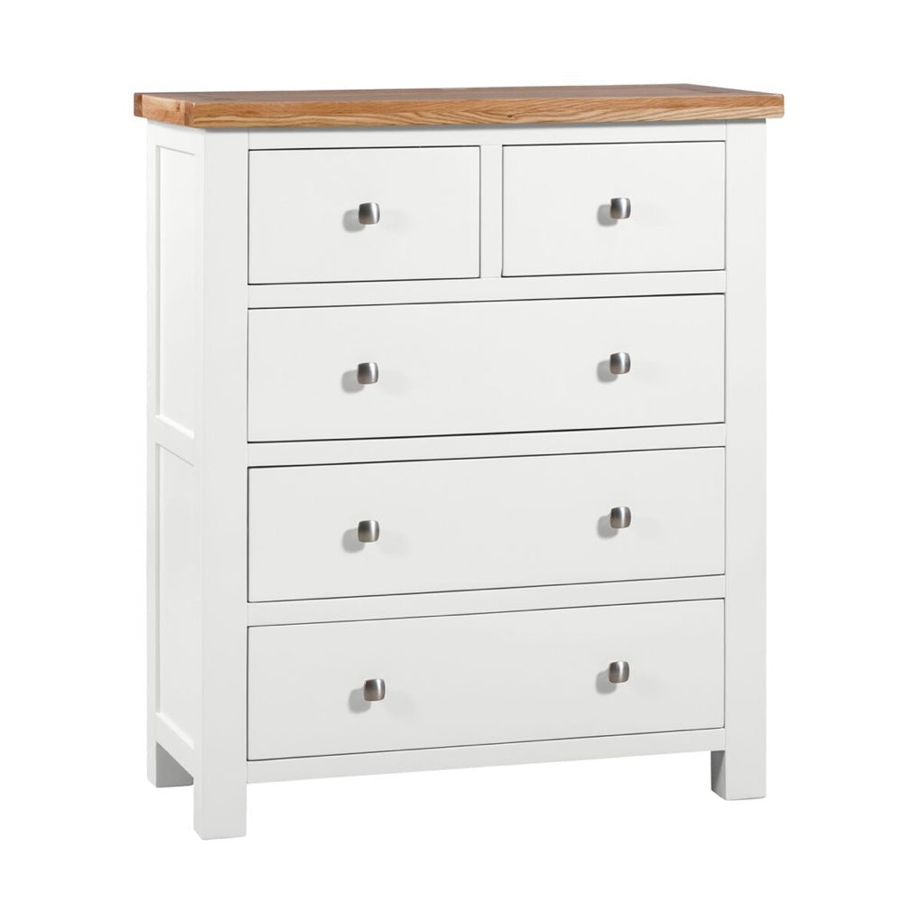 A 2 over 3 chest of drawers with a painted white base and a Oak top. Perfect for bedroom storage, this solid wood chest of drawers has two compact drawers above three evenly proportioned wider drawers.
