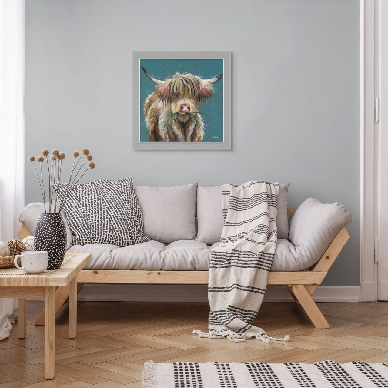 The Angus framed artwork features a striking depiction of a Highland cow, rendered in a contemporary style that harmonises with various decor themes. The beige frame complements the vibrant teal background, adding a touch of sophistication while allowing the artwork to stand out. Crafted with high-quality materials, this piece showcases exceptional craftsmanship, making it a timeless addition to your home. The lively brushstrokes and expressive details in the cow's fur and face add character and warmth, perfect for creating a focal point in any room. With dimensions that fit comfortably in both small and large spaces, the Angus is easy to incorporate into your curated collection of art, requiring minimal care to maintain its beauty.