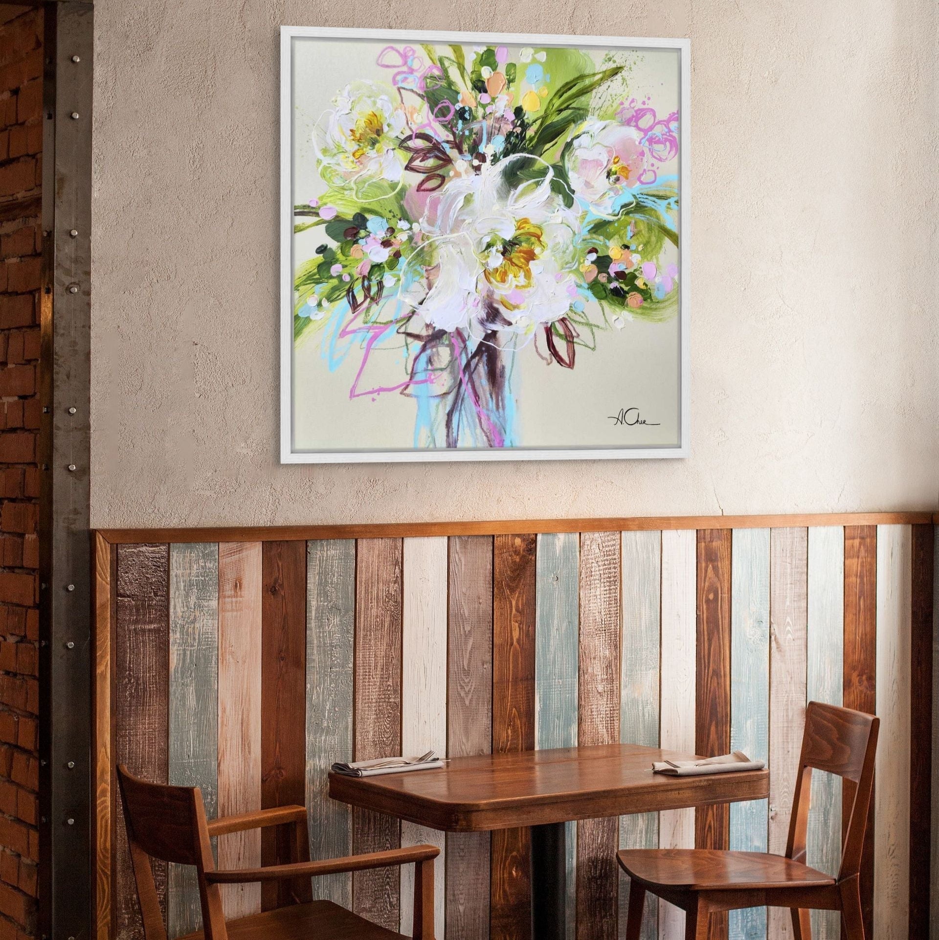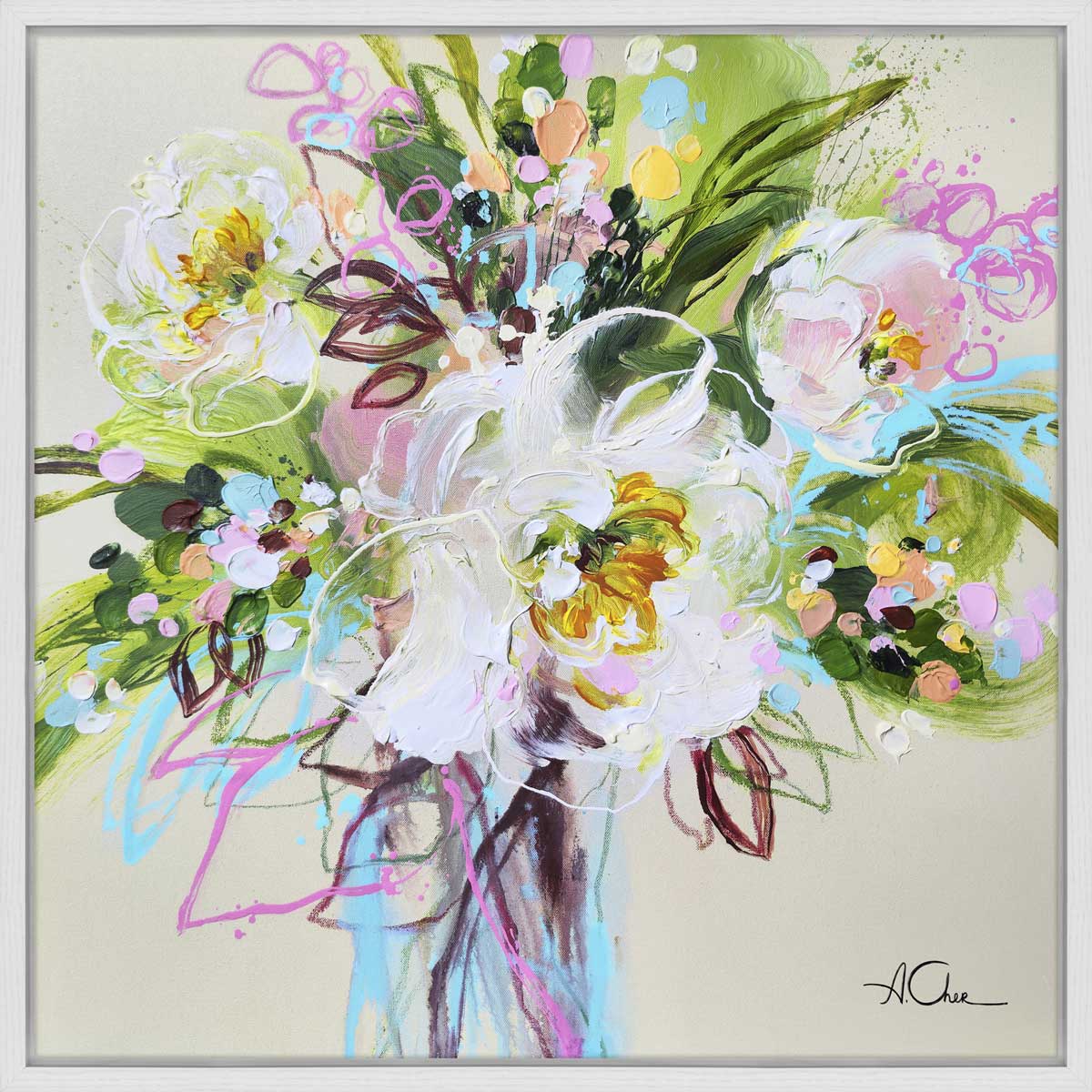 Elevate your space with the vibrant 'You Are Amazing' artwork, perfectly framed in a slim white limed wood effect that adds a touch of contemporary elegance. This colorful abstract painting features an exuberant arrangement of flowers, rendered in a harmonious blend of soft pastels and bold hues, including whites, pinks, and greens. The energetic brushwork and varied textures create a lively focal point, making it ideal for any room in your home. With a signature at the bottom right corner, this piece exudes artistic authenticity. The quality craftsmanship ensures durability, allowing you to enjoy its beauty for years to come. Perfect for modern styling, it complements a variety of decor themes, from minimalist to eclectic.