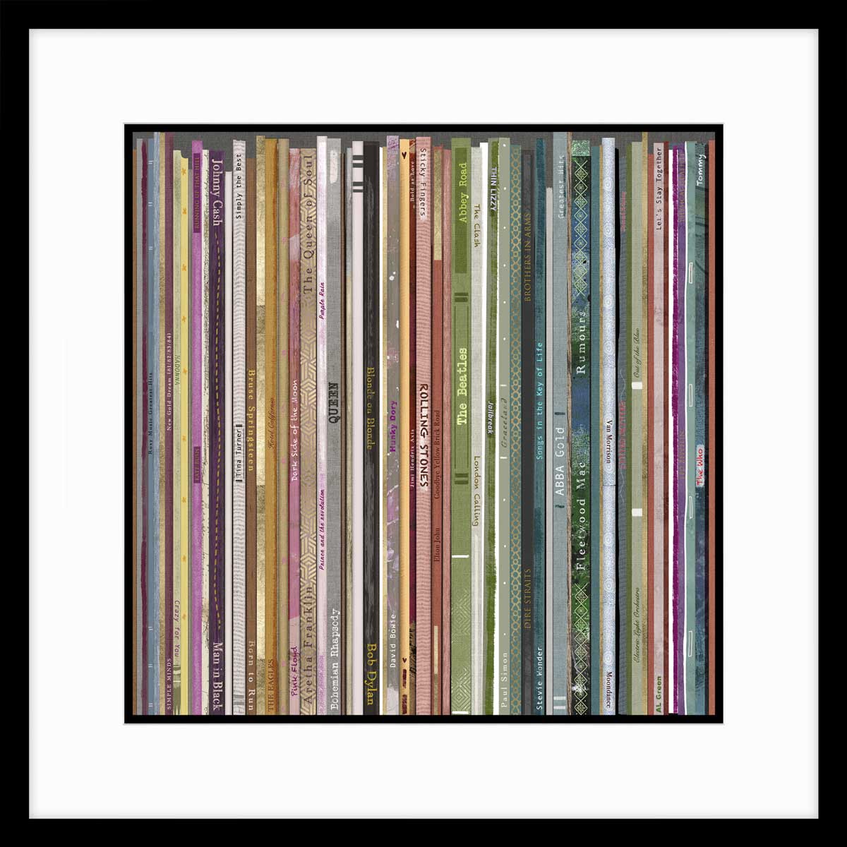 The 'Greatest Hits' framed art piece brings a contemporary flair to your space with its striking black frame and elegant white mount. This artwork features an array of colourful album spines, showcasing a curated selection of iconic music history. The vivid colours and textures of the album covers create a vibrant focal point, perfect for music lovers and design enthusiasts alike. Crafted with quality in mind, the frame is made from durable materials that ensure lasting beauty. Ideal for living rooms, music rooms, or home offices, this piece not only enhances your decor but also expresses your passion for timeless music and craftsmanship.