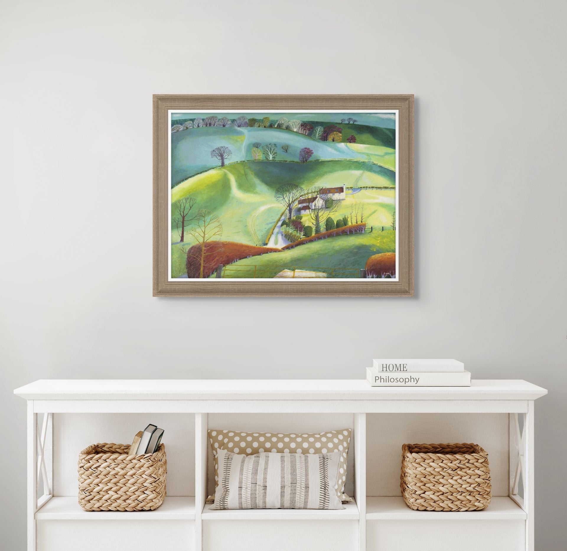 The Green Valley artwork features a beautifully hand-finished wood effect frame, complemented by a crisp white mount that enhances the vibrant colours of the landscape. The artwork itself is crafted using a textured gel technique, providing depth and a tactile quality without the use of glass. This ensures a contemporary feel while allowing the rich hues of green and earthy tones to shine through. The scene captures the tranquility of rolling hills, dotted with trees and quaint cottages, making it a perfect addition to any room seeking a touch of nature. The meticulous craftsmanship ensures lasting quality, making it a timeless piece for your home.