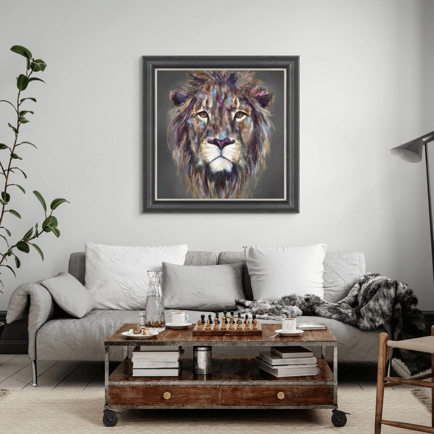 The Kendi, Large artwork print features a striking lion portrait, rendered in rich, vibrant colours that capture the essence of this majestic creature. Hand-finished with a unique brush stroke texture, this piece brings a tactile quality to your decor without the distraction of glass. The black frame complements the artwork beautifully, enhancing its contemporary style while adding a sense of sophistication. Measuring 116cm square, it serves as a captivating focal point in any room. Designed for easy integration into your home, this print is ideal for enhancing living spaces, offices, or creative environments, showcasing quality craftsmanship that stands the test of time.