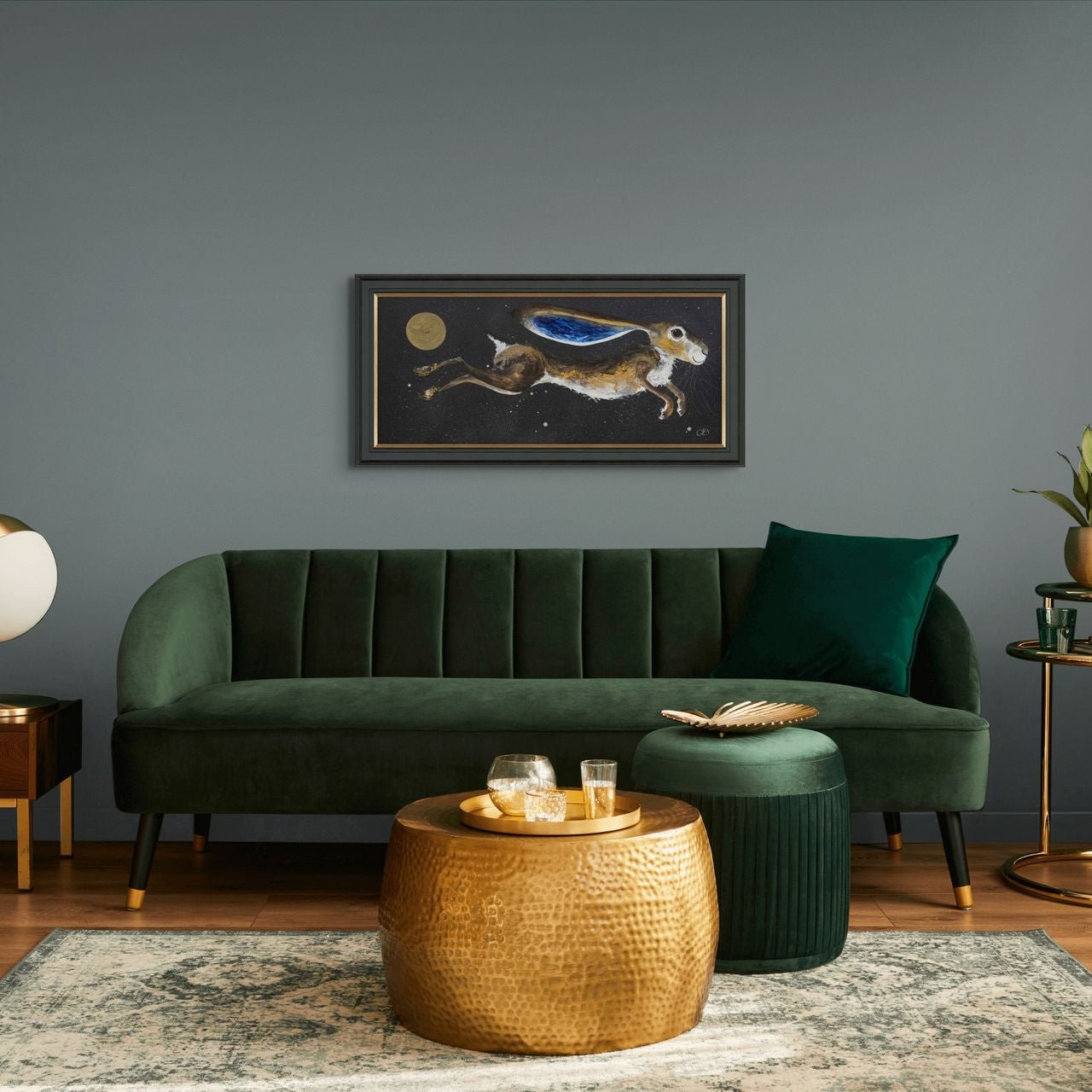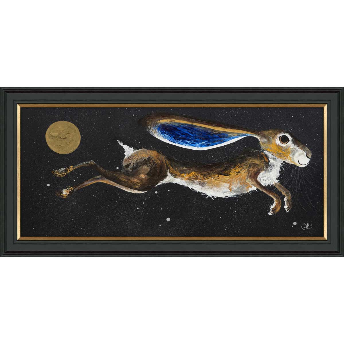 The Moondance artwork features a striking depiction of a hare in mid-leap, set against a deep black background that evokes the mysteries of the night sky. The black frame is complemented by a luxurious gold mount, enhancing the piece's contemporary elegance. Hand-finished with gold foil, the artwork captures a sense of movement and whimsy, making it a captivating focal point in any space. Crafted with attention to detail, the vibrant colours and textures bring the hare to life, inviting viewers to explore its enchanting world. This piece not only showcases quality craftsmanship but also adds a timeless charm to your decor, making it an ideal addition to both modern and classic interiors.