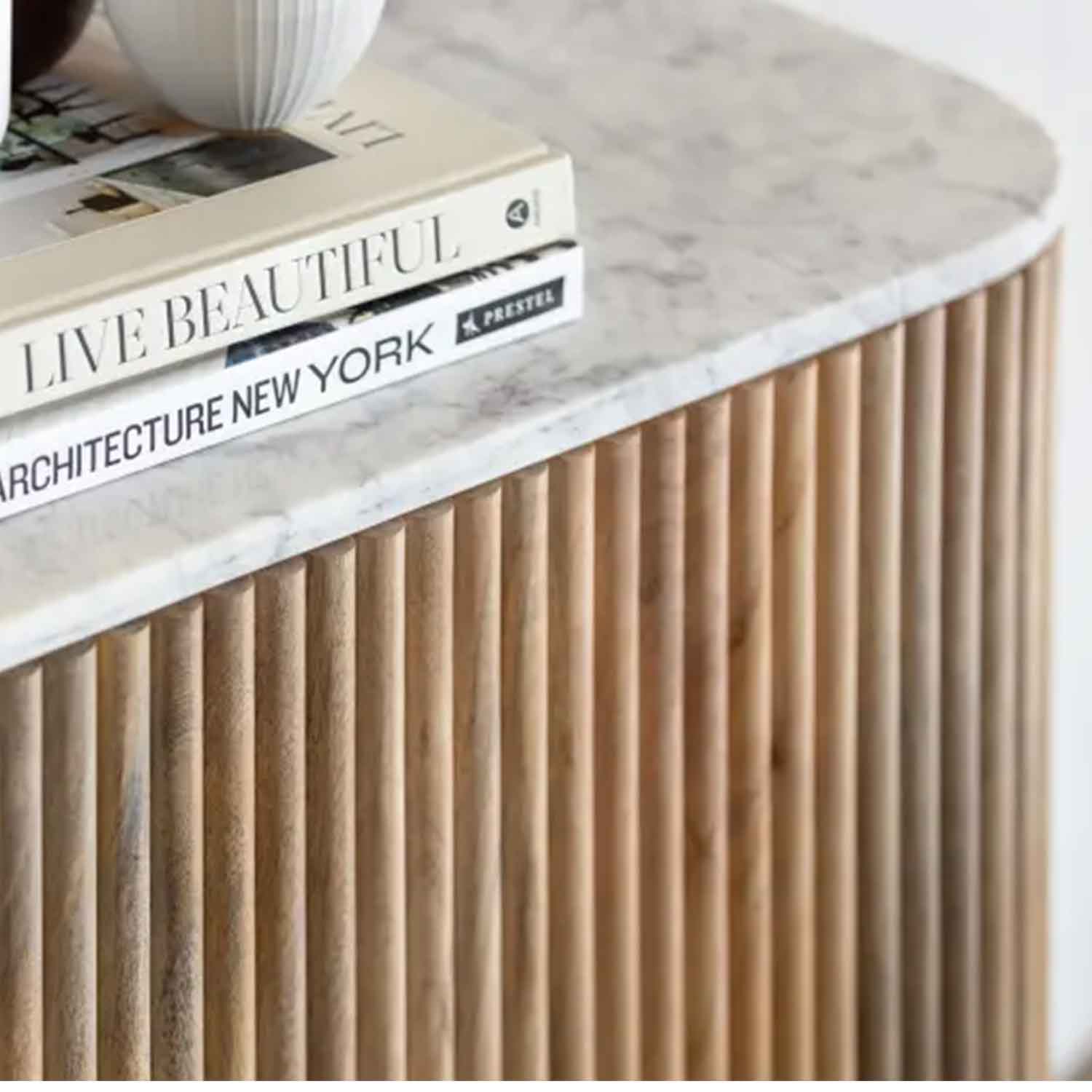 Celebrating the Mid-Century Modern look with a Scandinavian feel, our Calcutta TV unit with a Marble Table is an elegant TV unit with a contemporary fluted mango wood base and a white marble top.