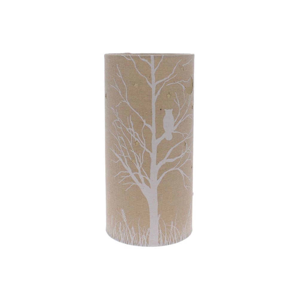 This lovely owl fabric lamp comprises of a fabric column surrounding an LED bulb (not supplied) with an owl perched in a tree on the outside edge in white print with additional details in cutouts in the fabric.