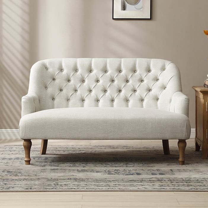 The Bianca 2 seater small sofa is a timeless petite sofa with plump seat, eye-catching tufted back and traditional washed wooden legs.