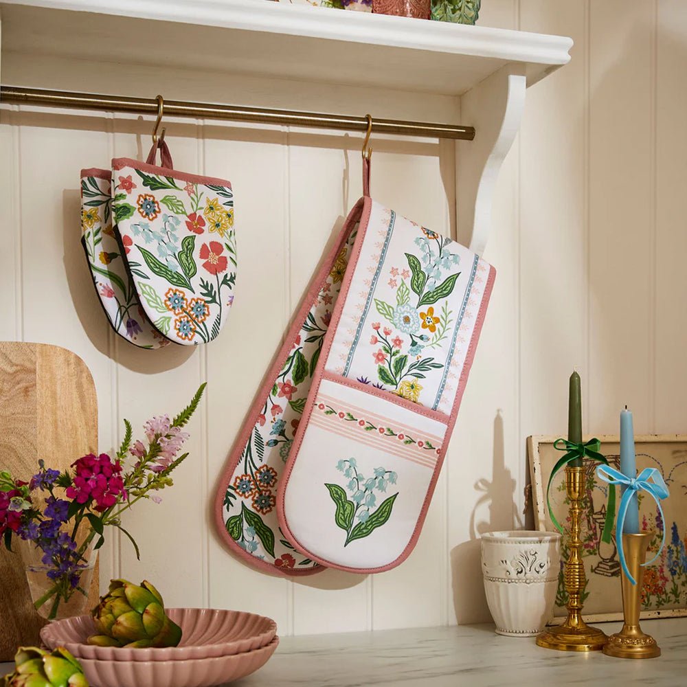 The Petals and Prose Double Oven Glove combines classic charm with a contemporary edge, featuring hand-illustrated wildflower designs in elegant patterns. Crafted from high-quality cotton, this glove provides effective heat protection while maintaining flexibility and grip. The double-ended design ensures both hands are covered, improving safety and ease when handling hot dishes or bakeware. A durable quilted finish reinforces insulation and comfort, while the handy hanging loop keeps storage effortless. Machine washable for easy care and built for everyday use, this oven glove brings together practical functionality and timeless style—a considered addition to any modern kitchen.
