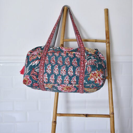 Pine Green, Red, Pink & Mustard Block Print Quilted Duffle Bag