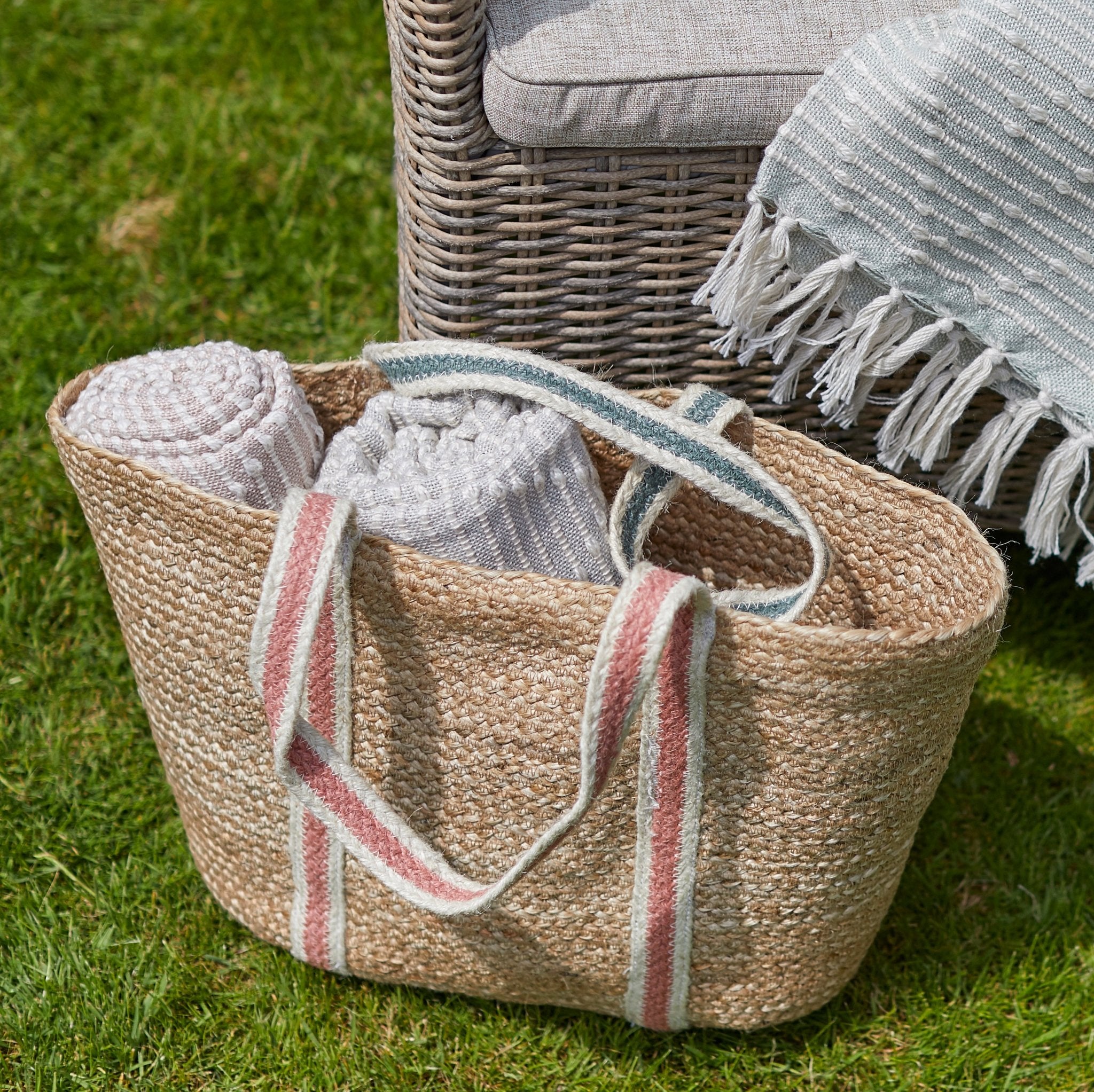 Made from organic jute and hand sewn this short-handled tote bag makes for the perfect summer accessory. The rose and thistle coloured handles add a cheerful pop of colour, briging a charming touch to this eco friendly bag.
