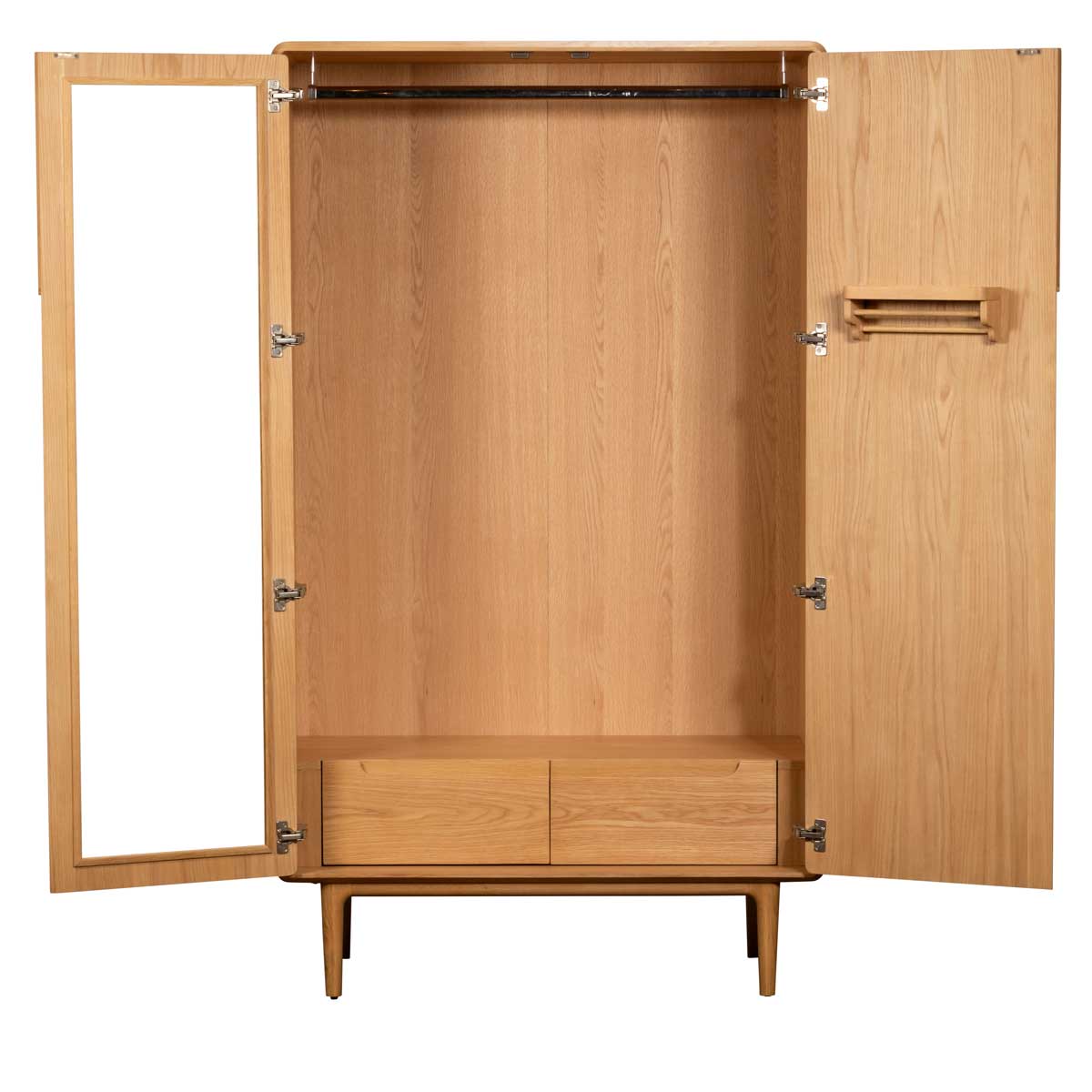 This Winchester wardrobe from G-Plan has two double doors. Both doors open individually to reveal ample clothes storage space inside. There is full width hanging rail allowing for full length hanging of clothes and also a vintage style tie rack on the inside of the right door, and a mirror on the inside of the left door.