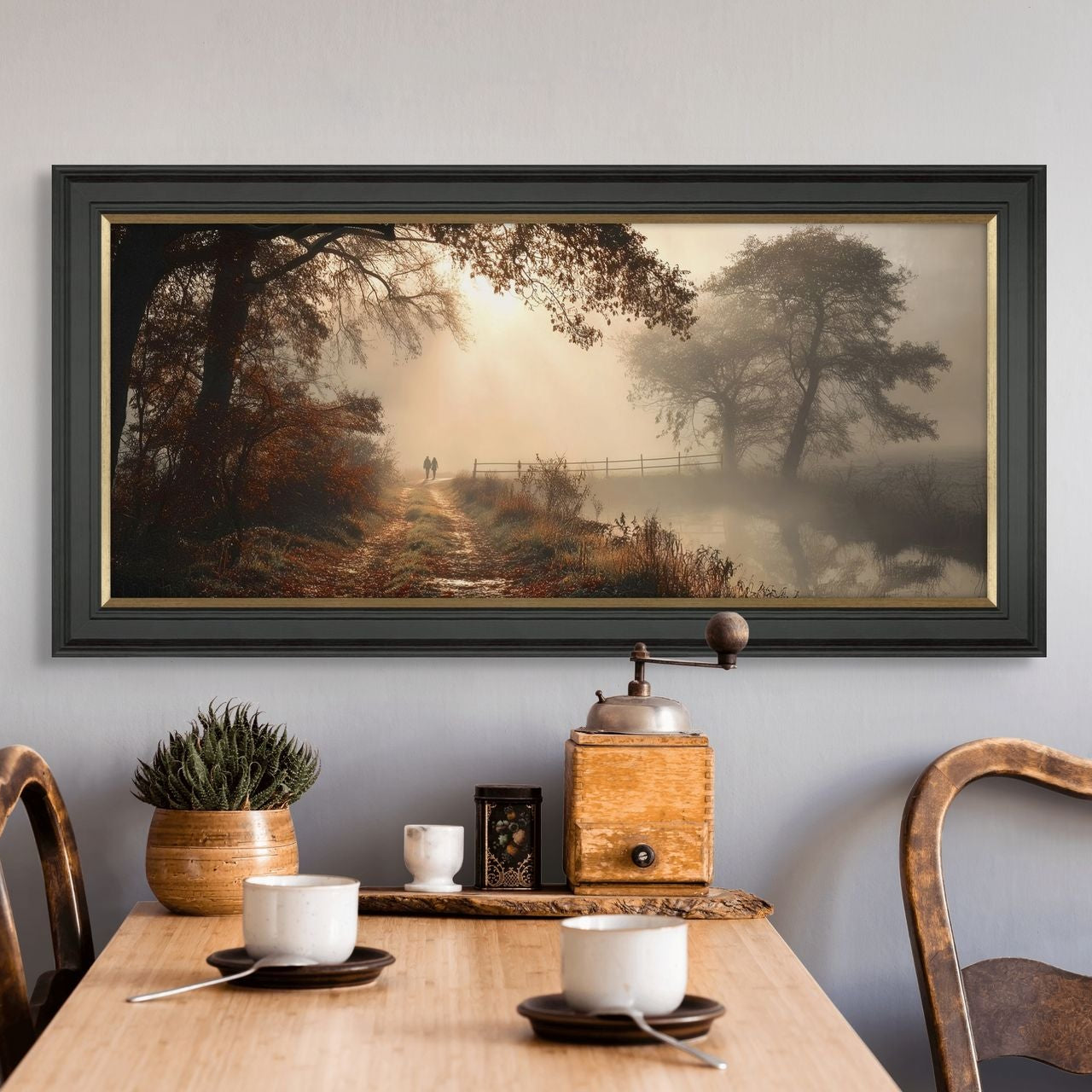 The Amber Afternoon artwork features a striking black frame with a refined gold trim, expertly hand-finished with a textured gel that enhances its unique visual appeal. Without the barrier of glass, the surface showcases the intricate textures of the piece, inviting a more intimate viewing experience. The warm tones of the scene depict a serene landscape, capturing the essence of a peaceful afternoon walk. Crafted with an attention to detail that speaks to quality and timeless craftsmanship, this piece is designed to complement a variety of contemporary interiors. Its dimensions make it suitable for prominent display in living rooms, hallways, or personal galleries, effortlessly elevating your space with its curated elegance.