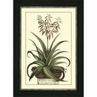 Antique Aloe artwork by artist Abraham Munting. An attractive Aloe with proud green leaves and a beautiful flowered top sits inside of a vintage floral pot on top of a concrete pillar. This art is finished in a black frame with an added silver edging.