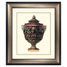 This Antique style urn artwork with a detailed vase with a black background and red detailing by Antonini DaCarlo is finished with a bronze scoop frame.