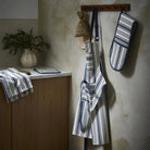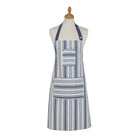 A woven multi-width stripe apron in Blue and natural cotton has an industrial inspired design, enhanced with small stylish details like double stitched edges and brass rivets.