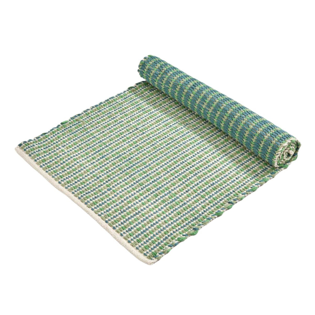 Cotton rug in natural blue or green tones with a zig-zag pattern. This Capri rug is rolled and tied with cotton tape. Perfect for a bedroom or living room.