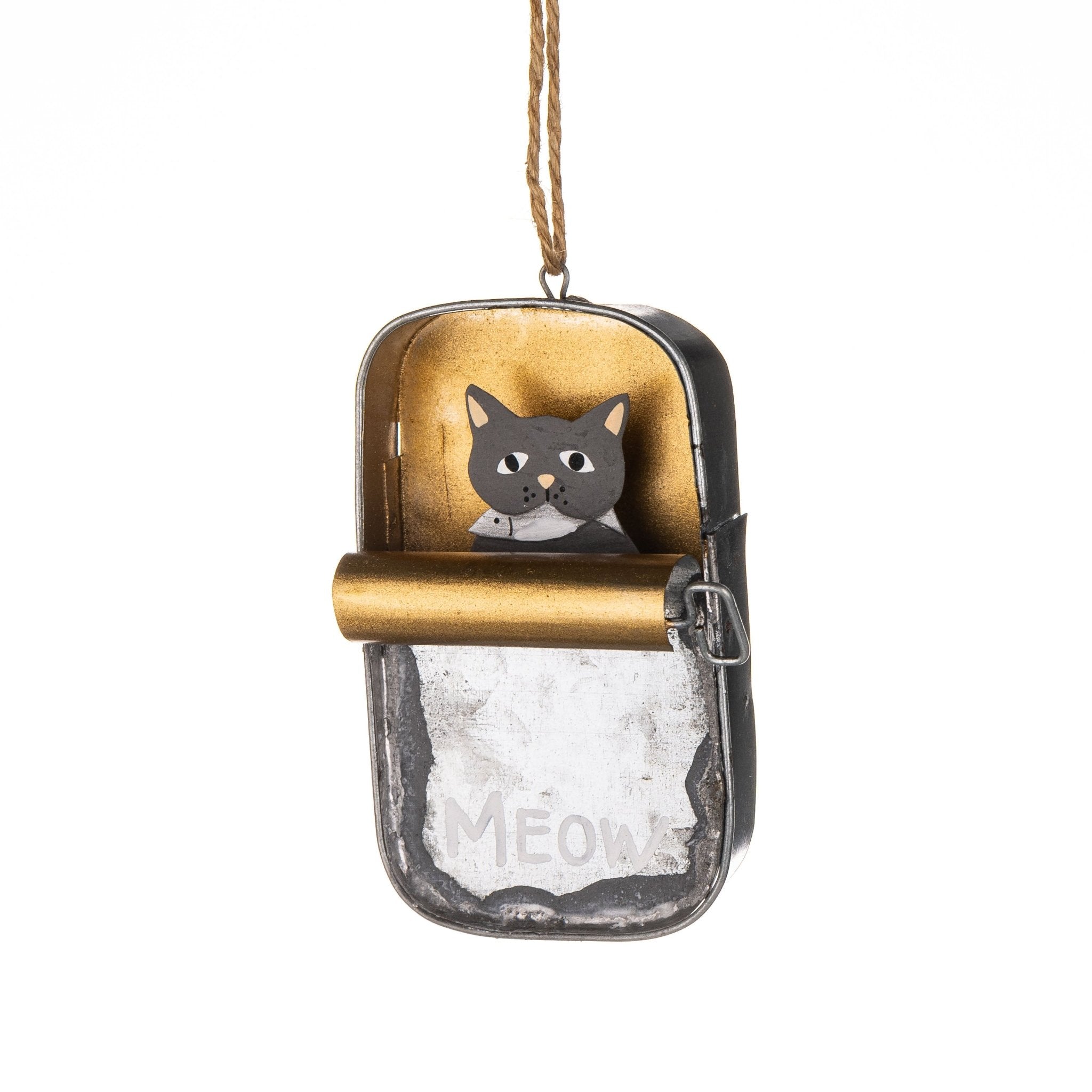 This fun cat decoration would make a great to add to your seaside collection or as a gift for a Cat lover. A grey cat is hiding in this metal sardine tin, with Meow in silver writing beneath - a fun cat decoration.