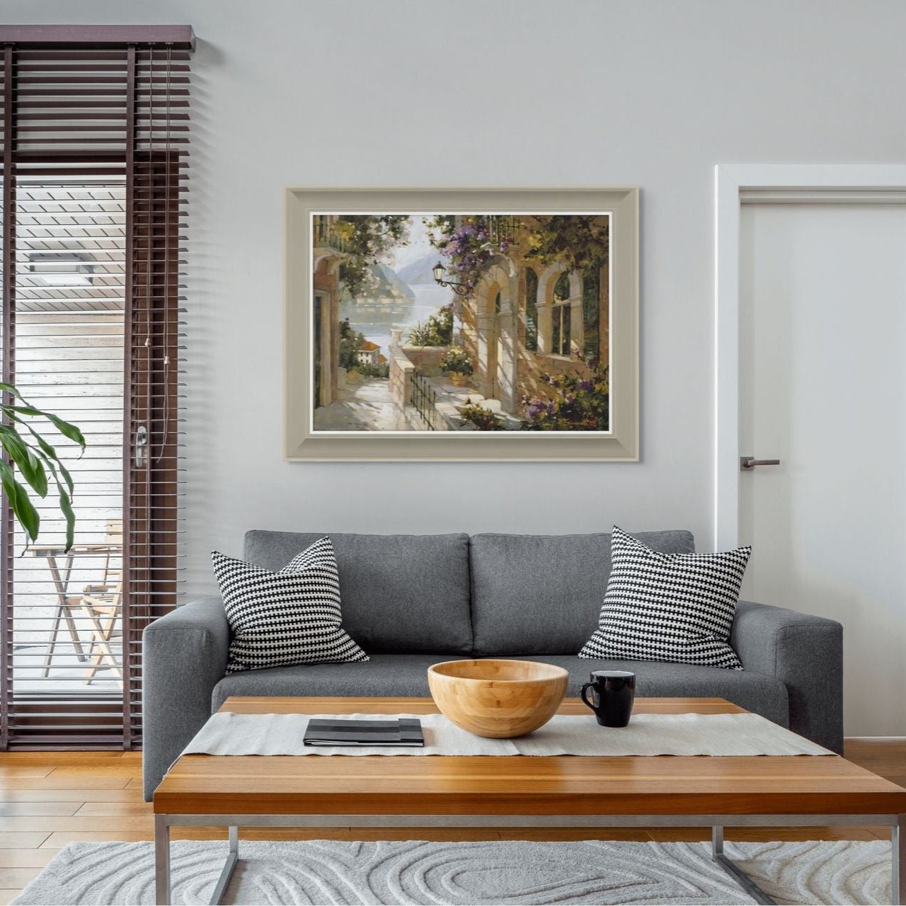 The Como Cottage artwork print captures a serene moment in a sunlit Italian village. Hand-finished with a textured gel, this piece offers a unique depth and tactile quality that enhances its visual appeal. The sand-coloured frame complements the warm tones of the artwork, allowing it to seamlessly integrate into various interior styles. Measuring 116cm wide, this print is perfect for adding a touch of elegance to living rooms, hallways, or bedrooms. With no glass, the piece is lightweight and easy to hang, making it a practical choice for any space. Experience timeless craftsmanship that brings a contemporary flair to your home decor.