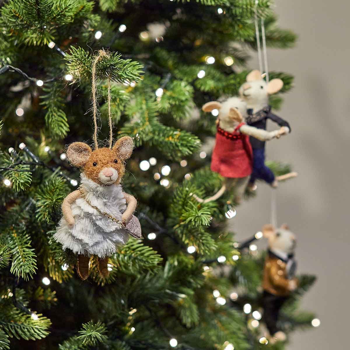 A cute Mouse decoration, dressed to impress! In a white fluffy dress, this mouse has a silver handbag! A great hanging decoration for your home or tree.