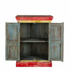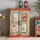 This smaller, hand-painted cabinet, which is new, but painted in the vintage style. With two doors and vibrant advertising-style artwork over the panels, this cabinet is a real talking point. The skill of the artisan Fair Trade painters is apparent.