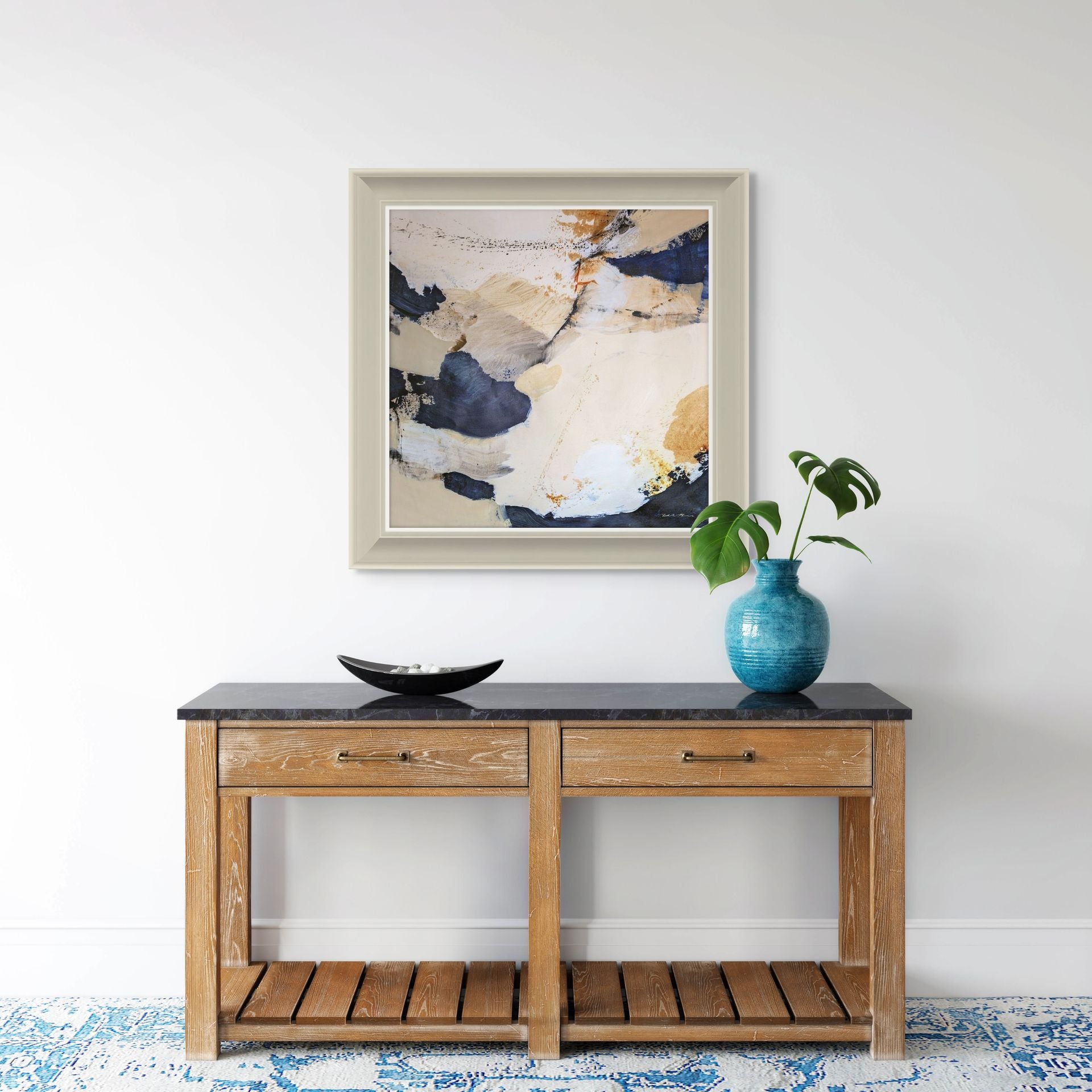 The 'Depth of Tranquility' framed artwork brings a serene yet dynamic presence to your space. This hand-finished piece features an abstract print crafted using textured gel, resulting in a visually rich surface that invites touch and contemplation. The subtle palette of soft creams, deep blues, and warm gold accents creates a harmonious balance, making it suitable for various interior styles. The absence of glass ensures a tactile experience, allowing the intricate details to shine through. Framed in a light, contemporary frame, this artwork is not only a statement piece but also a versatile addition that complements both modern and classic decor. Elevate your living area, office, or bedroom with this timeless piece that reflects quality craftsmanship and thoughtful design.