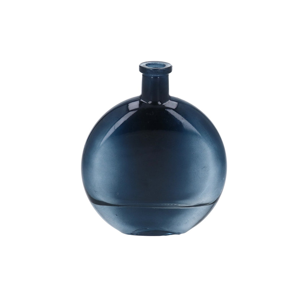 A small disc shaped glass vase in a choice of two colours, these small round glass vases are perfect for a single stem or small group. In muted deep glass colours, Emerald Green or Navy.