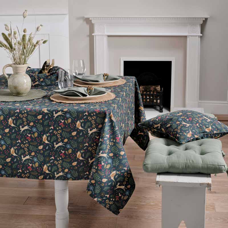 This Napkin set is made of 100% cotton in our endearing enchanted forest print in autumnal hues featuring charming woodland creatures, plants and berries, and trees all on a dark green background. This set of napkins is lovely on your table all year round, from Christmas to summer al fresco dining. We think you'll enjoy the charming design as will your dinner guests.
