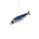A felted mackerel with detail stitching and sequin decorations that is about as festive as a mackerel can be!!