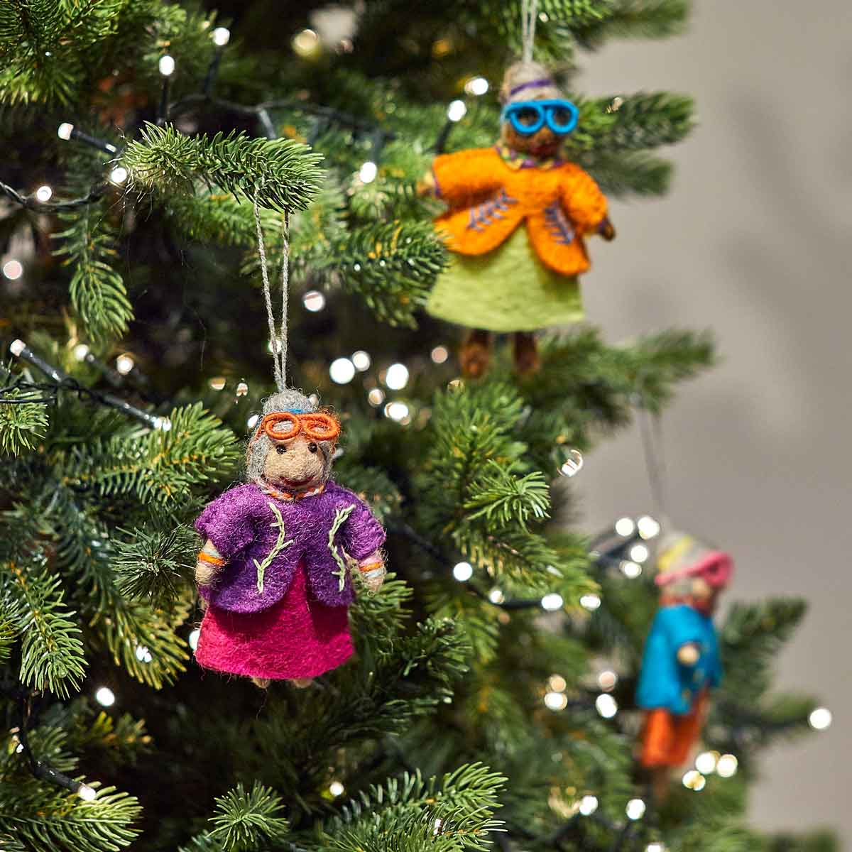 This needle-felted Granny has a neon pink skirt and amazing funky orange glasses! Guaranteed to brighten up your tree this Christmas, this granny decoration is ready to funk up your Christmas!