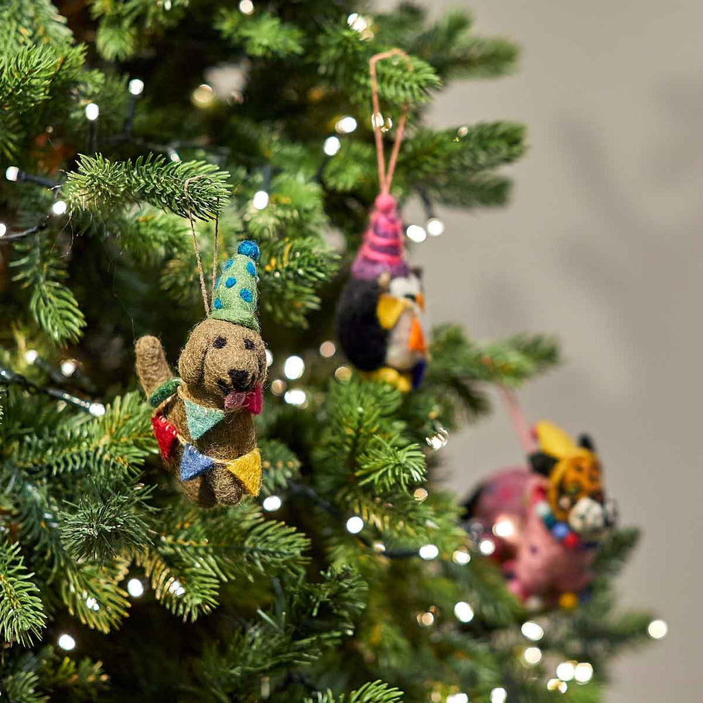 This brown dog is here to fetch the fun and unleash a wag-worthy time. With multi-coloured bunting wrapped around him and a green party hat speckled with blue spots, this adorable pup is ready to make your next gathering a howling success.