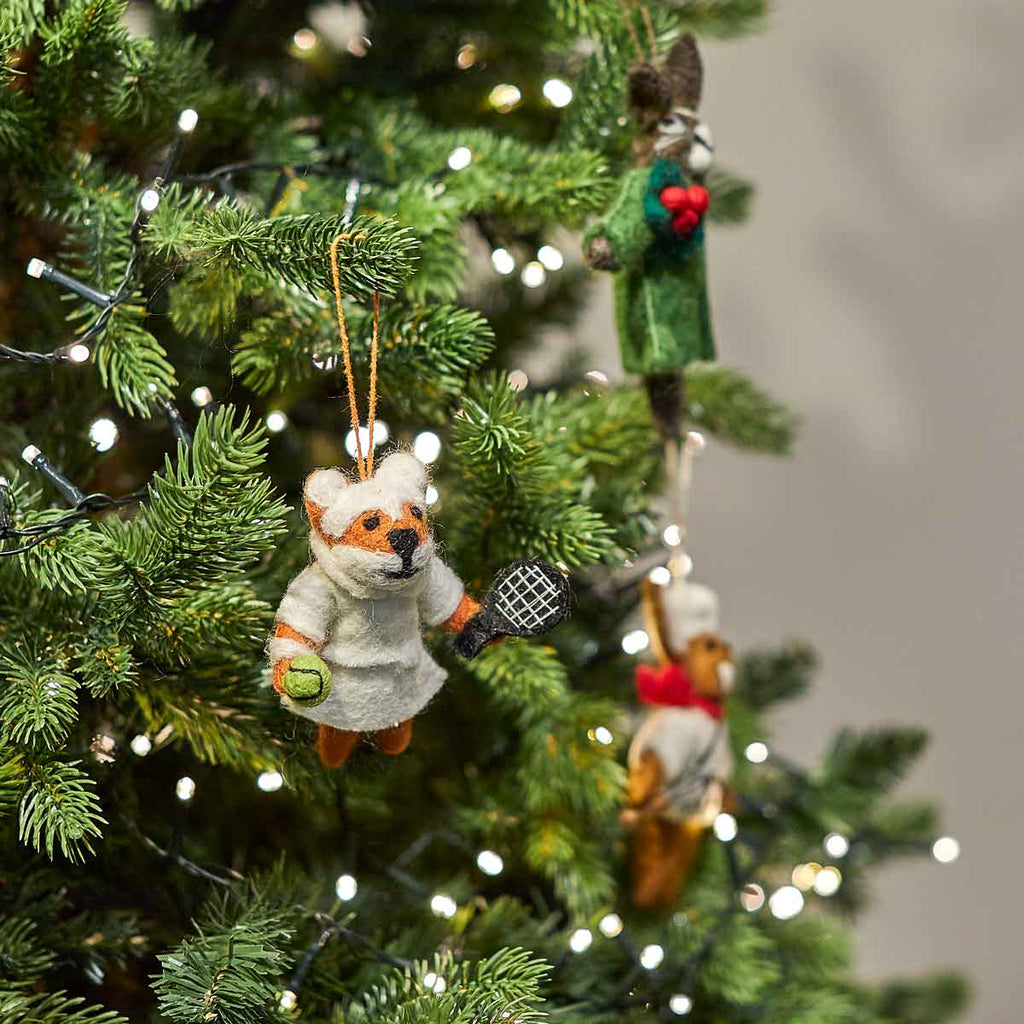 This tennis playing Fox decoration has been handcrafted using traditional needle felting techniques in Nepal.