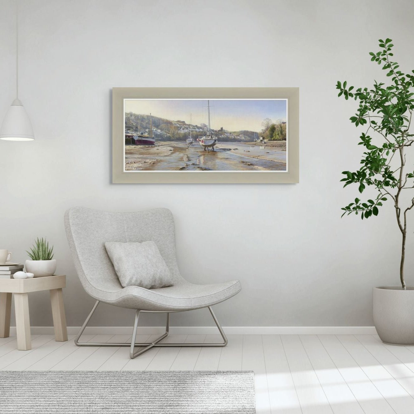 Introducing 'First Light On The Harbour,' a stunning framed print that captures the serene beauty of a coastal landscape. Hand-finished with a textured gel, this piece offers a unique tactile quality without the use of glass. The sand-coloured frame complements the tranquil hues of the artwork, enhancing its contemporary appeal. Featuring boats resting gently on the shore, the print evokes a sense of calm and invites the essence of nature into your home. Ideal for various settings, this artwork is not only a visual delight but also a testament to quality craftsmanship. Dimensions and care instructions ensure that this piece maintains its beauty for years to come.
