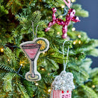 A Cosmopolitan cocktail bauble, hand embroidered with sequins, buttons and thread. This is a bright cocktail bauble hanging decoration which would add a real talking point to your decorations this year as well as some glam!